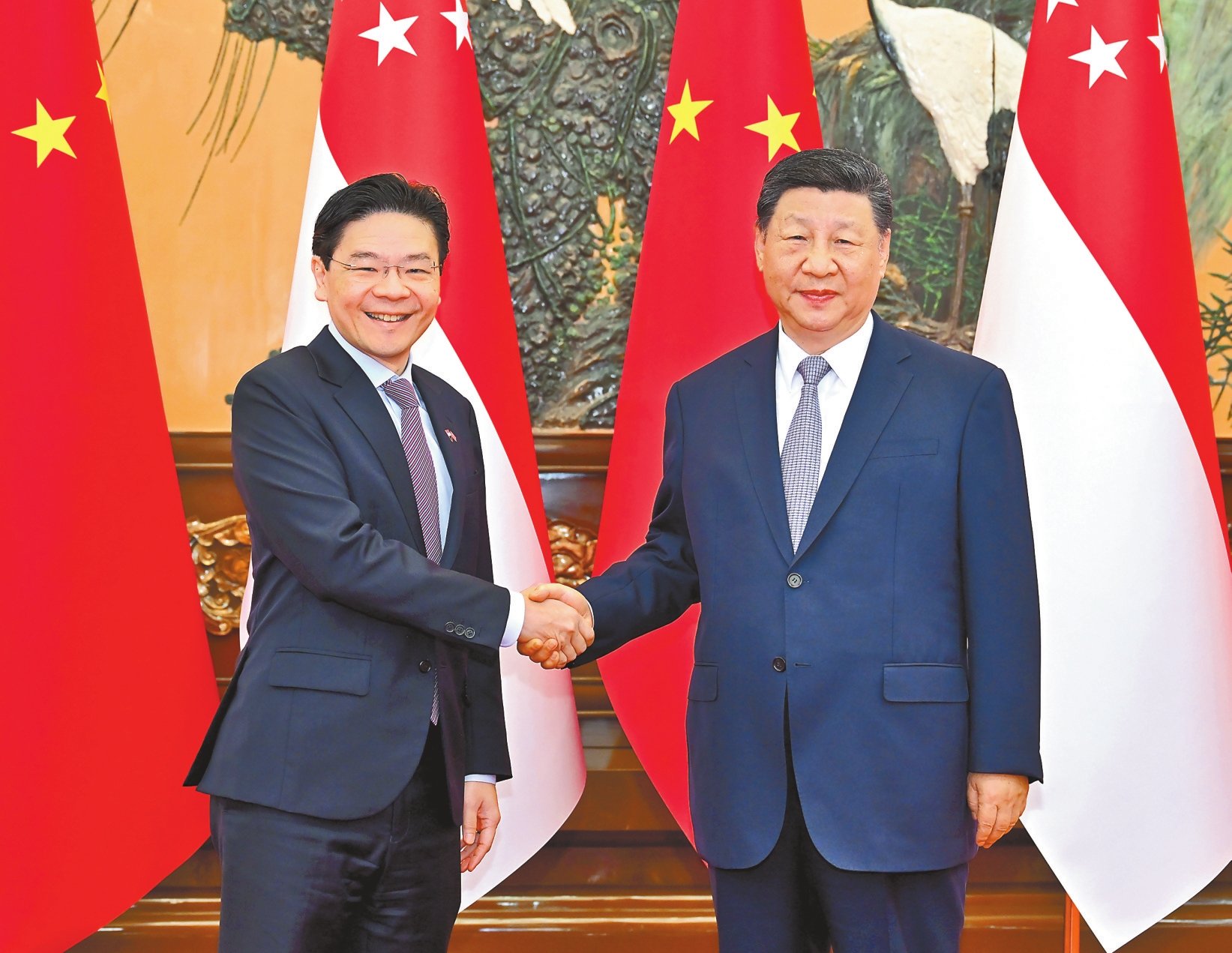习近平强调,中新要牢牢把握两国友好大方向,始终从战略高度和长远角度看待和发展中新关系,确保航向不偏、动力不减。要筑牢中新友好政治基础,支持彼此核心利益和重大关切,以更高水平政治互信服务两国关系发展。中方欢迎新方继续深度融入中国发展,双方要深入推进共建“一带一路”合作,打造数字经济、绿色发展、人工智能等领域标志性成果,推动重大项目提质升级,续写高质量合作新篇章。要鼓励两国人民常来常往,深化人文交流合作,让中新友好更加深入人心。中方始终认为,和平、发展、合作、共赢的时代潮流不可阻挡,世界不能重拾霸权主义,不能被拖回丛林法则。中方愿同新方一道,站在历史正确一边、站在公平正义一边,共同倡导平等有序的世界多极化、普惠包容的经济全球化,推动世界走向和平、安全、繁荣、进步的光明前景。