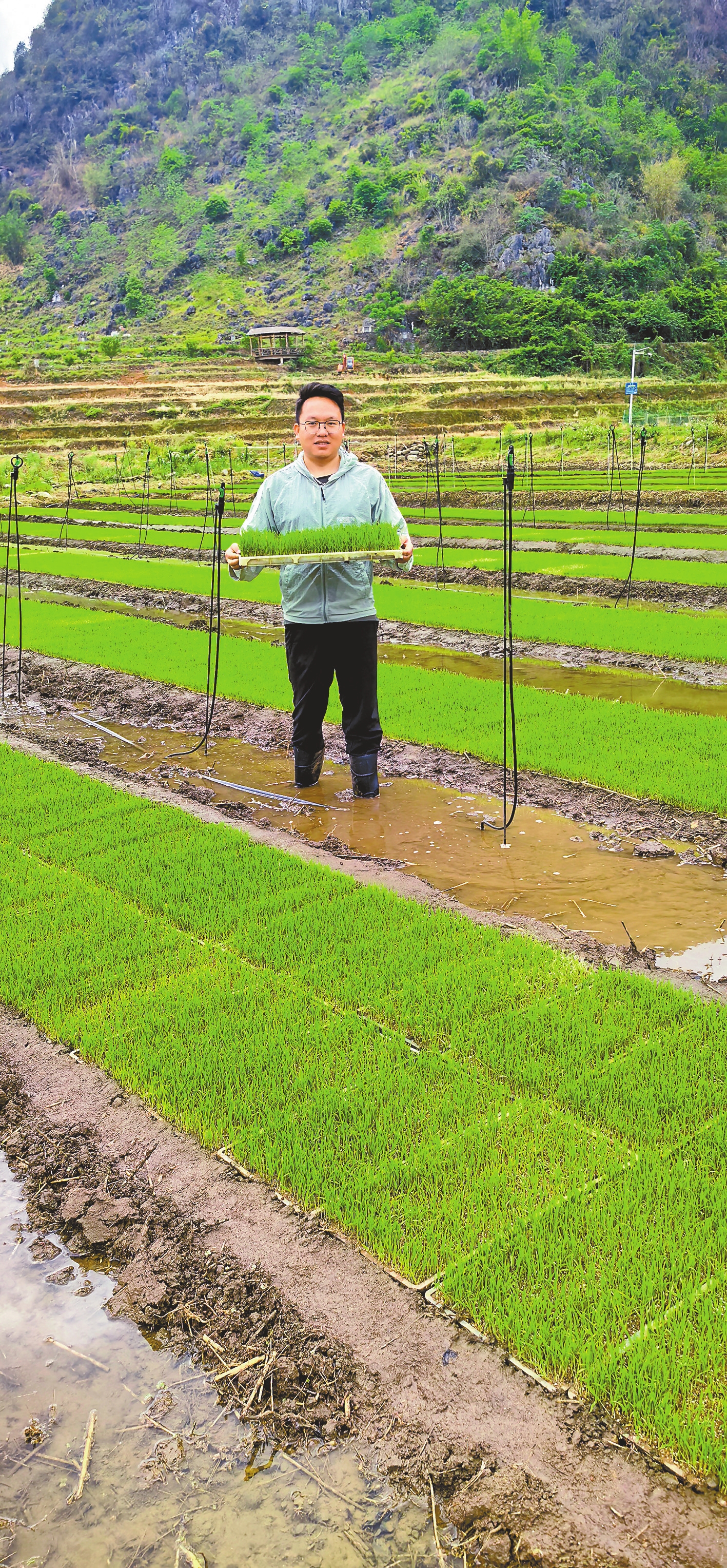 六月的广南县八宝镇宛如一幅田园画卷,水田澄澈如镜,嫩绿的秧苗在微风中轻轻摇曳,生机盎然。晨光中,罗明达挽着裤腿,赤脚踏入刚插完秧的稻田,弯腰拨开秧苗仔细查看根系生长情况。这位31岁的壮族汉子,将青春镌刻在故乡的土地上,书写着新时代青年的奋斗篇章。