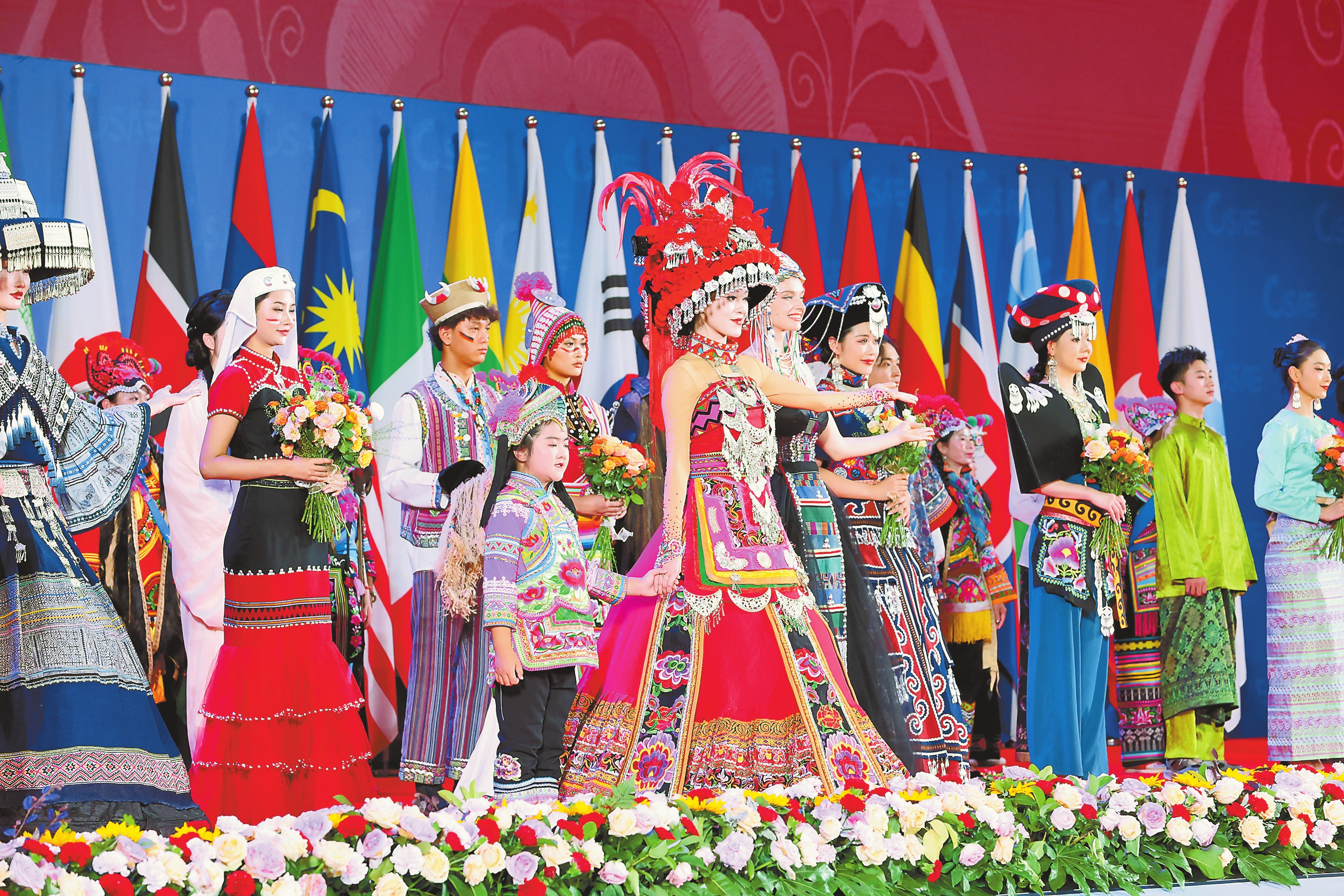 南博时装周上,庄重大气的彝族服饰、灵动飘逸的布依族服装、色彩斑斓的纱丽等悉数闪亮登场,伴随着欢快的音乐,每天上演精彩的时装秀,千年彝绣与当代潮流的完美交融,彩云之南的迷人色彩化作云裳上的动人旋律。参加时装秀的各国、各地区的非遗服装服饰、特色服装服饰带着其民族风情与文化底蕴,共同演绎一场跨越国界、融合民族的时尚盛典。