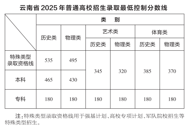 本报讯(记者 陈怡希) 6月25日,经省招生考试委员会审定,2025年云南省普通高校招生考试录取最低控制分数线划定并公布。