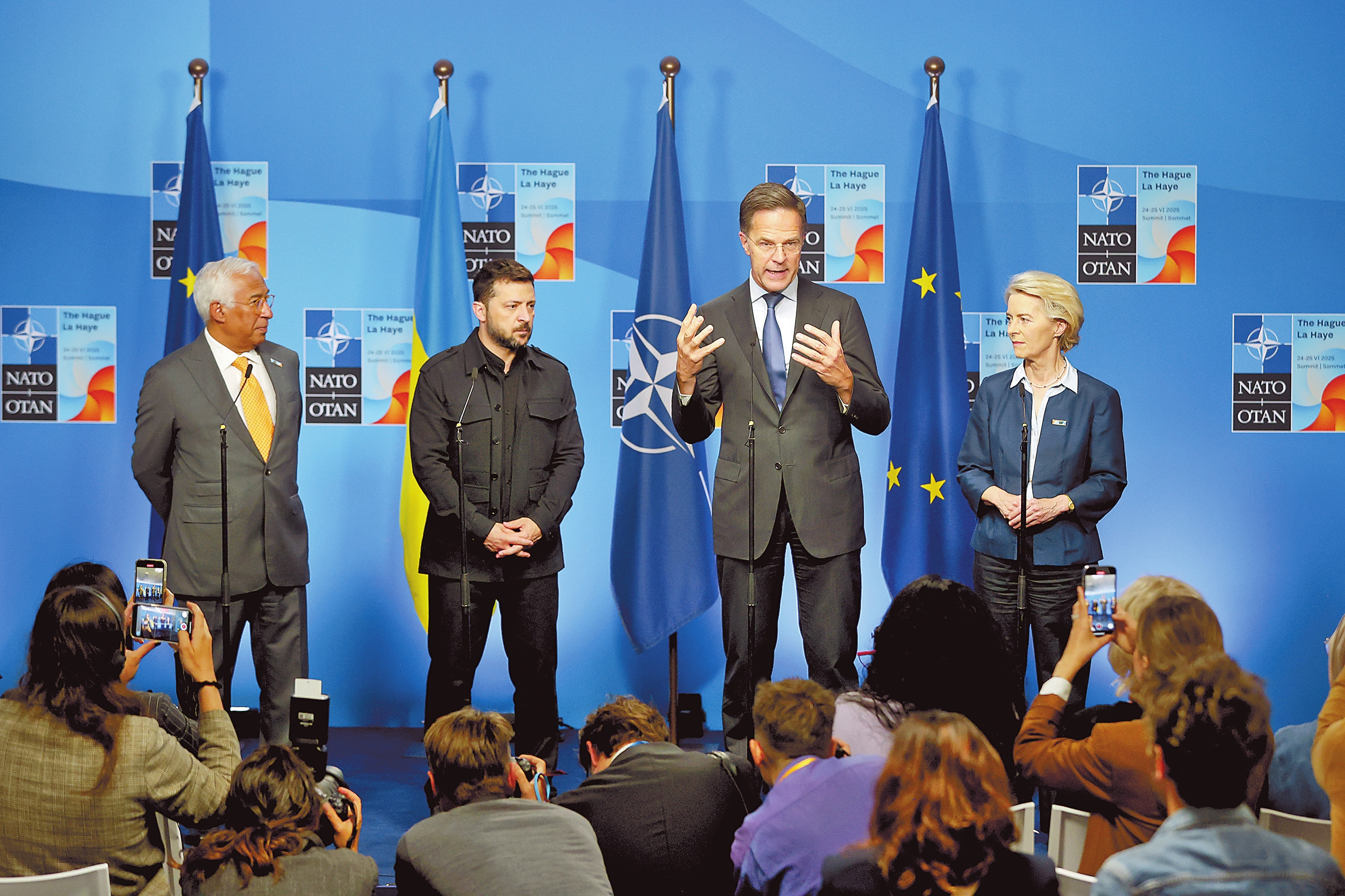 六月二十四日,在荷兰海牙,欧洲理事会主席科斯塔、乌克兰总统泽连斯基、北约秘书长吕特和欧盟委员会主席冯德莱恩(从左至右)在北约峰会期间共见记者。新华社记者 赵丁喆 摄