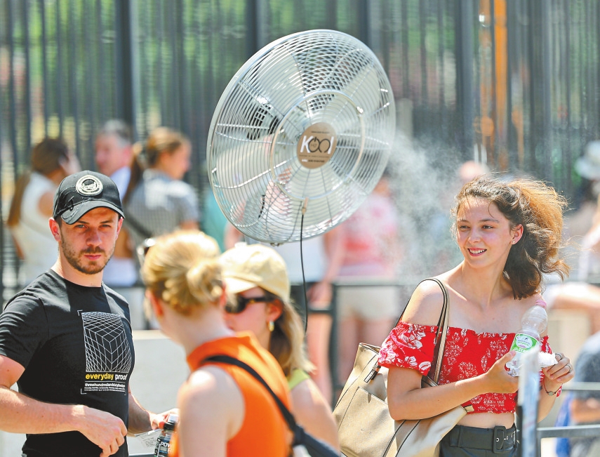 6月27日,在意大利罗马,游客在斗兽场附近一处风扇下纳凉。当日,意大利卫生部高温预警公告显示,6月27日至29日,全国主要城市将迎来大范围高温天气,包括罗马、米兰、佛罗伦萨在内的12个城市发布连续3日高温红色预警。新华社记者 李京 摄