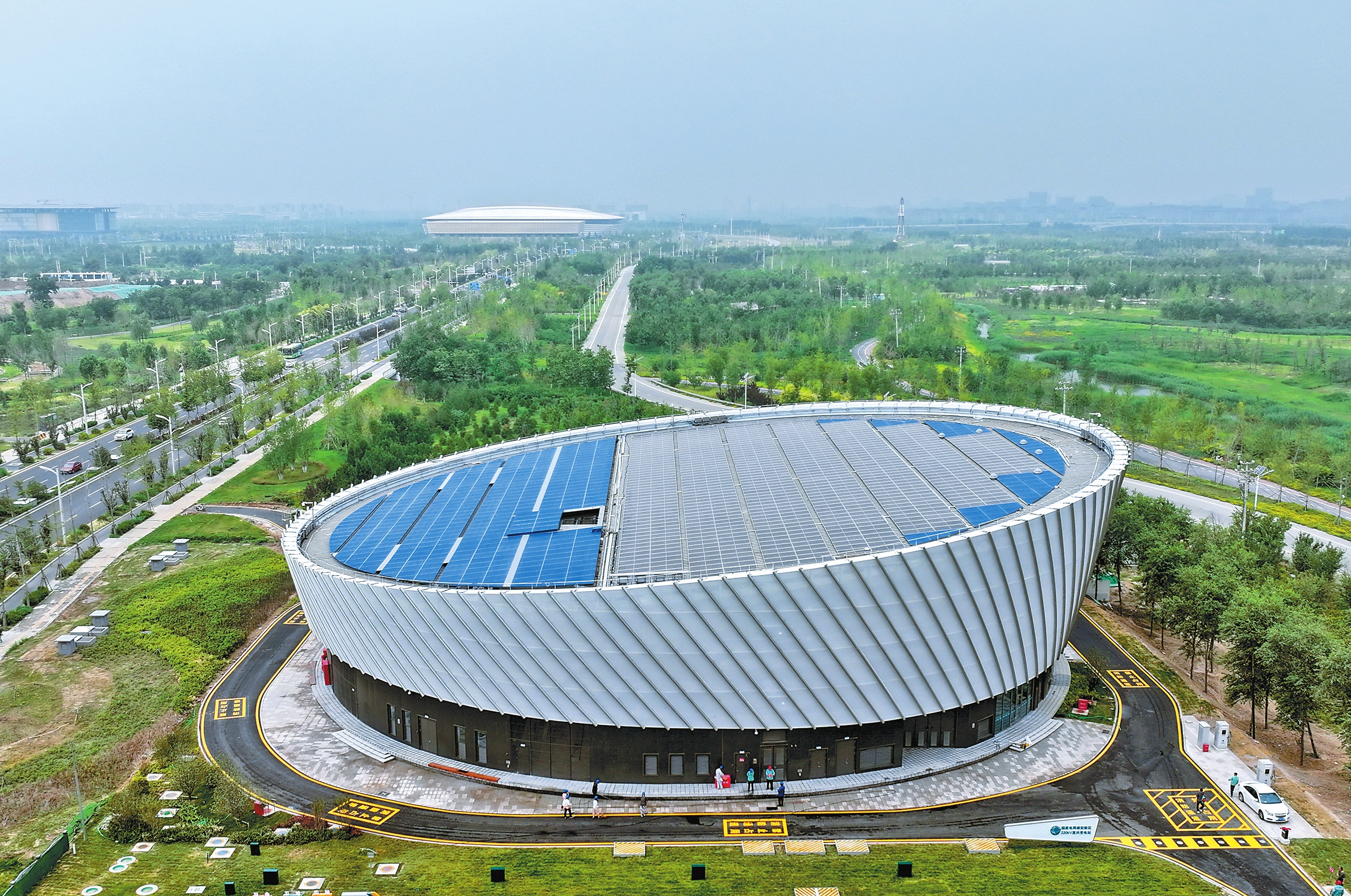 6月30日,雄安新区绿色建造示范工程——复兴220千伏变电站投运。据国网河北建设公司介绍,该变电站设计方案融合了海绵城市、碳足迹管理、能耗重组等8项绿色建设解决方案,采用智能化系统、水循环系统、零碳监测系统等15项低碳技术,实现全生命周期“近零碳”。它是雄安新区首个全生命周期“近零碳”变电站、首个圆形钢结构变电站,变电容量360兆伏安,是雄安新区220千伏分区环网重要枢纽变电站,将担负起启动区总部聚集核心区域供电任务,为北京疏解企业和高校用电提供强有力保障。图为当日,工人在雄安新区复兴220千伏变电站工作。 新华社记者 杨世尧 摄