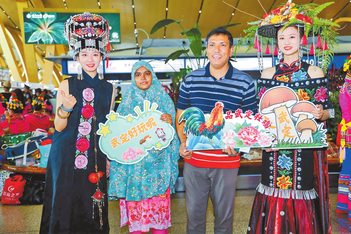 7月5日,武定县在昆明长水国际机场与南屏街双核联动,举办壮鸡野生菌美食季暨彝族火把节预热活动。甫抵机场的各国旅客瞬间被绚丽的非遗展演和彝族歌舞吸引,争相与身着民族服饰的工作人员拍照留念,沉浸式体验“有一种叫云南的生活”。