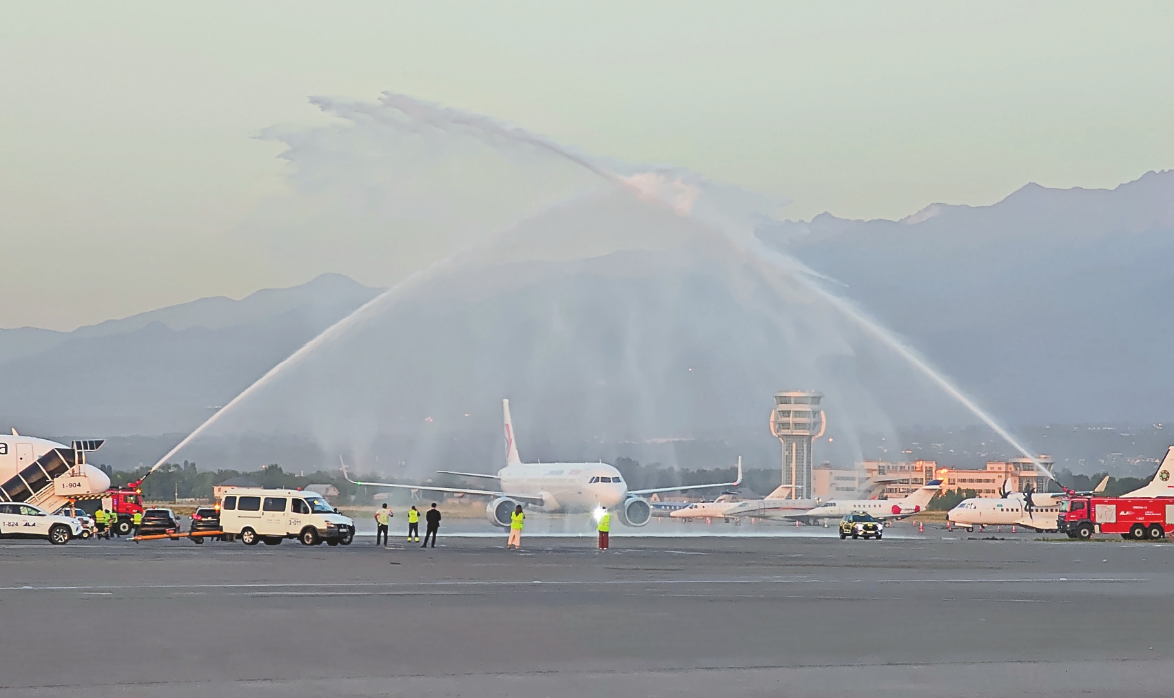 图为当日,在哈萨克斯坦阿拉木图国际机场,东方航空公司上海至阿拉木图直飞航线客机穿过象征民航最高礼仪的“水门”。 新华社发