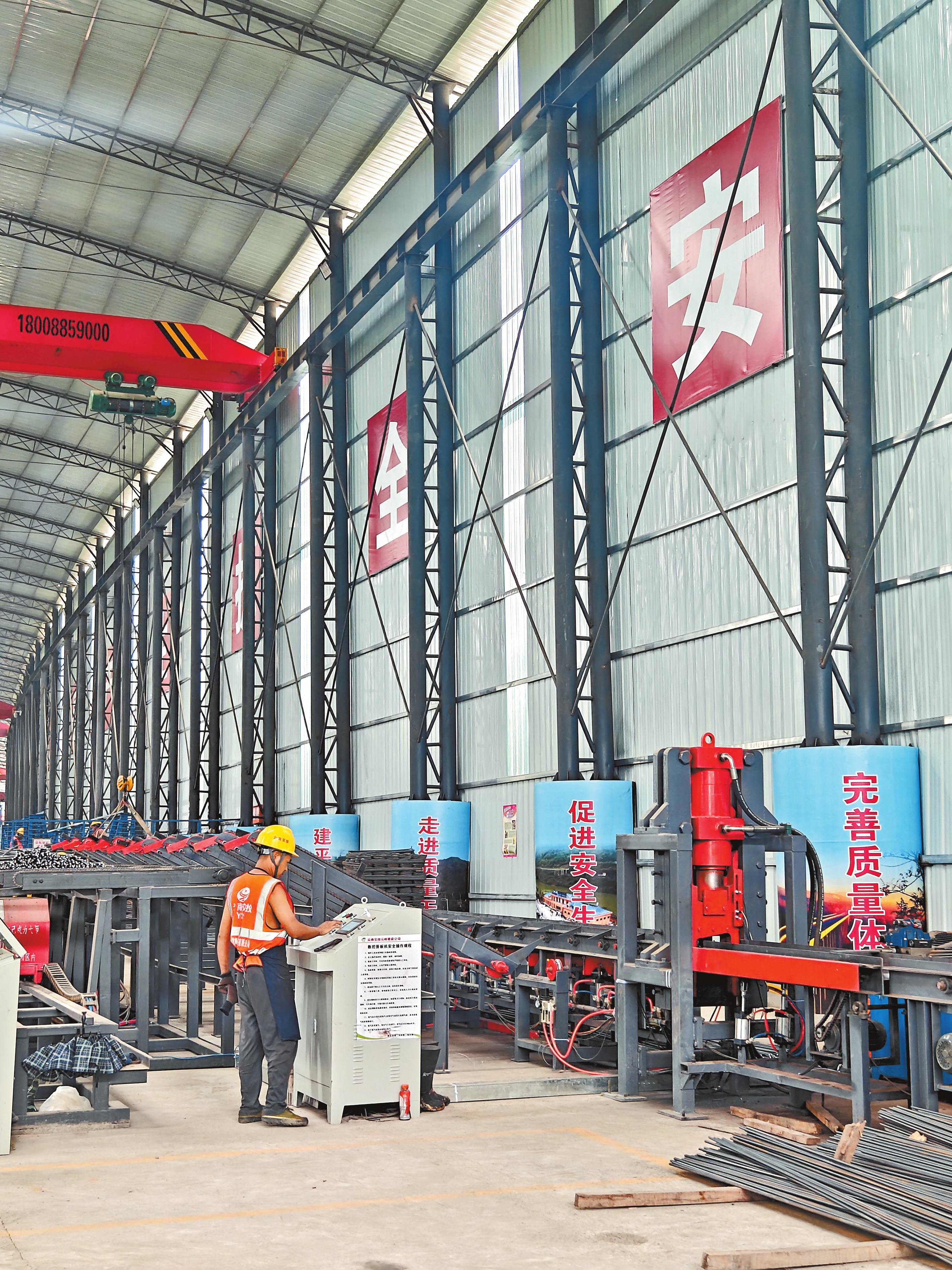 智慧梁场内,钢筋加工、移动台车、智能蒸养等功能区如精密齿轮般咬合运转,宛如一条“智造”流水线。
