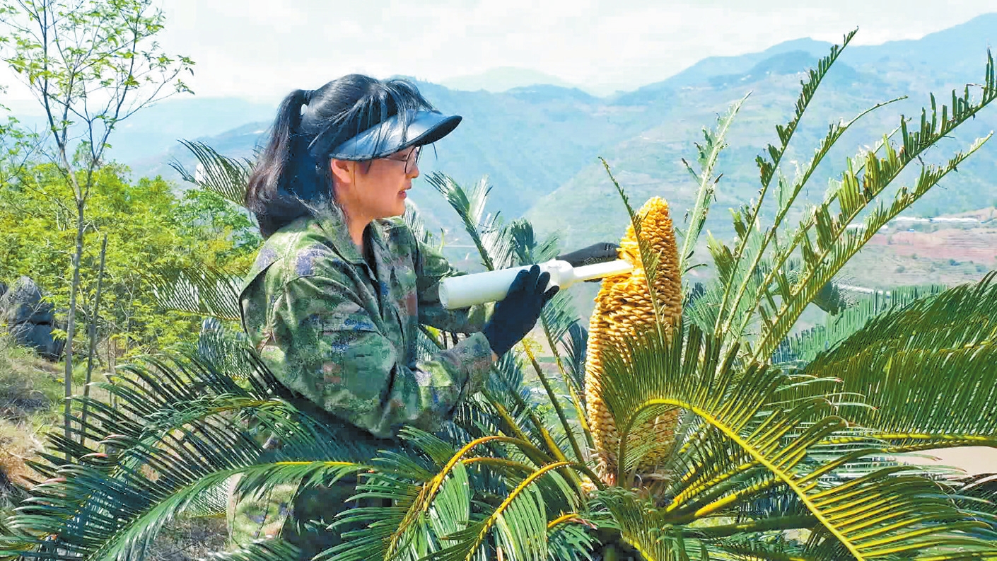 中国科学院昆明植物研究所研究员龚洵介绍,红河苏铁分布范围非常狭窄,目前在全世界范围内仅发现生长在个旧地区,被誉为“植物大熊猫”。红河苏铁有雌雄之分,往往是雄花先开,但当雌花需要授粉时,早已盛开的雄花花粉活性已大大降低,所以在自然情况下红河苏铁的繁育率很低。2015年,云南大围山国家级自然保护区管护局工作人员首次发现开花的红河苏铁,在中国科学院昆明植物研究所科研人员指导下,工作人员对红河苏铁进行了人工辅助授粉试验,开启了红河苏铁的人工扩繁工作。