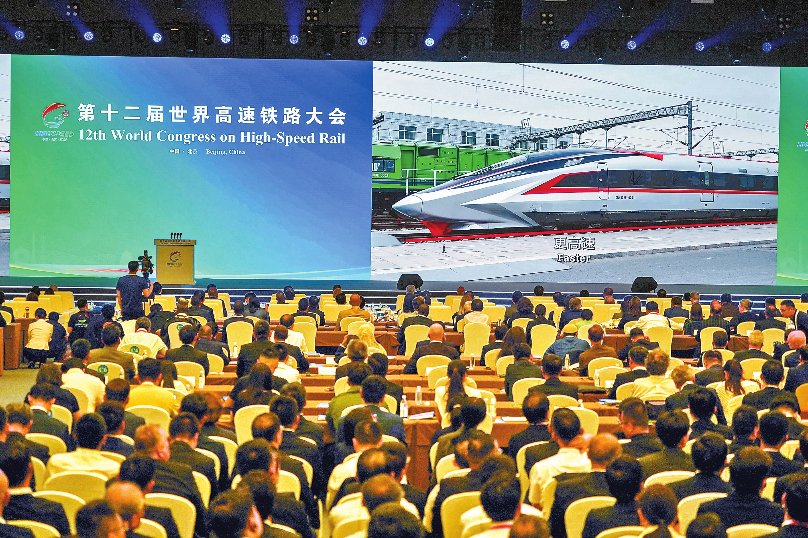 7月8日,第十二届世界高速铁路大会在北京举行。本届大会以“高速铁路:创新发展让生活更美好”为主题,由中国国家铁路集团有限公司和国际铁路联盟共同主办,国内外铁路技术人员、企业负责人、政府官员和国际组织代表等2000余人参加开幕式。图为第十二届世界高速铁路大会会场。 新华社记者 邢广利 摄