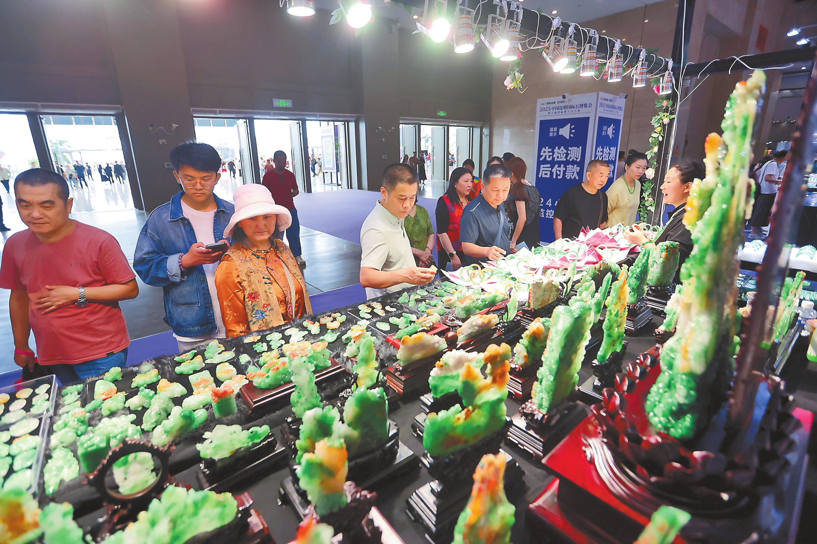 7月10日,2025中国昆明国际石博览会在昆明滇池国际会展中心开幕。本届石博会以“石韵天成、匠心传世”为主题,通过三大板块和四个维度打造五大主题展馆,展览面积5万平方米,2000个标准展位,汇聚了国内外100余家商协会及展团参展。展会期间还将举办研、演、赛、奖等40多场主题活动。图为市民游客在参观、选购商品。本报记者 陈飞 摄