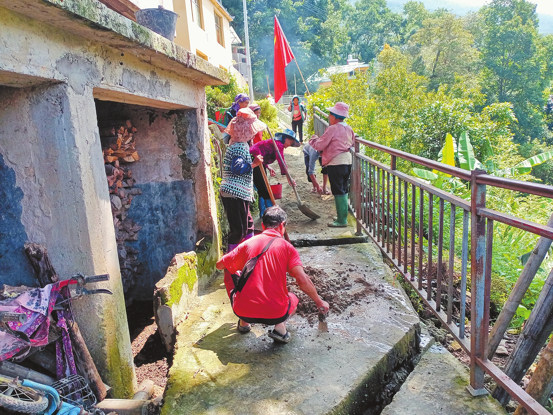 在埃洞村委会欧比村民小组,持续强降雨让进村路出现路面塌陷、坑洼积水等情况,影响60户村民日常出行。欧比村党支部第一时间召开紧急会议,借鉴该乡“万吨水泥进农村”项目成功经验,制定党群共治方案,党员带头、干群齐心抢修道路。
