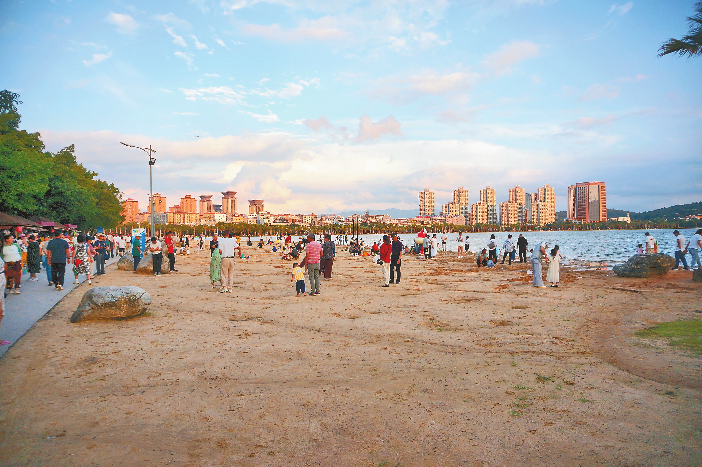 每天傍晚,湖泉生态园内随处可见沿湖边小道休闲漫步的市民游客。今年64岁的杨凯来自河北,2022年退休后便来到云南旅居。每天晚饭后,他都会骑上自行车到湖边小憩,听着音乐看日落,感受小城的清凉美好生活。“弥勒的宜人气候吸引了我。这里环境优美、物价实惠、生活方便,我打算继续长住下去。”杨凯说,他已经成为“新弥勒人”,有时还会从这里出发自驾到广西、贵州、四川等地游玩。