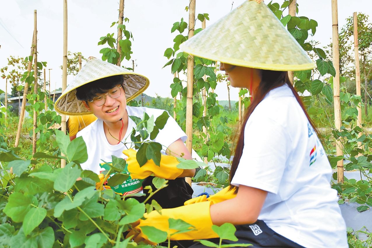 7月10日,在昌宁县鲜食葛根种植示范基地,来自重庆的西南大学青年学子顶着烈日给葛根修剪枝叶。暑期以来,西南大学暑期“三下乡”社会实践团队的学生来到昌宁县,把课堂搬进田间,躬身支农助农,丰富阅历,实践知识,助力乡村振兴。本报通讯员 字竟春 摄