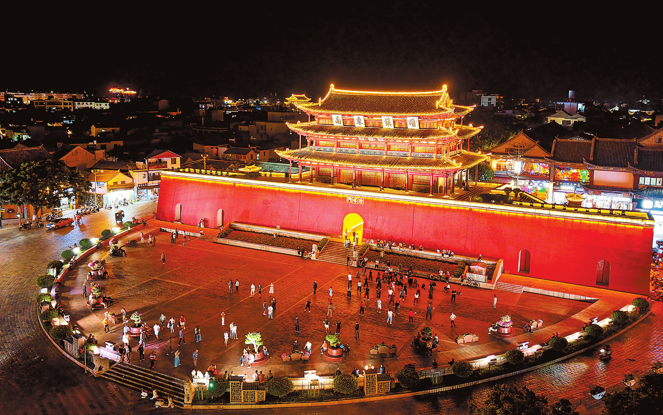 暑期以来,有着1200余年历史的建水古城成为八方游客的旅游目的地。游客们在朝阳楼前领略临安府“雄镇东南”的巍峨气势,在朱家花园的亭台楼阁间品读“滇南大观园”,在临安府署、学政考棚、建水文庙等景点感受“滇南邹鲁、文献名邦”的独特魅力。图为夜幕下的建水朝阳楼。本报记者 胡妤雅 摄