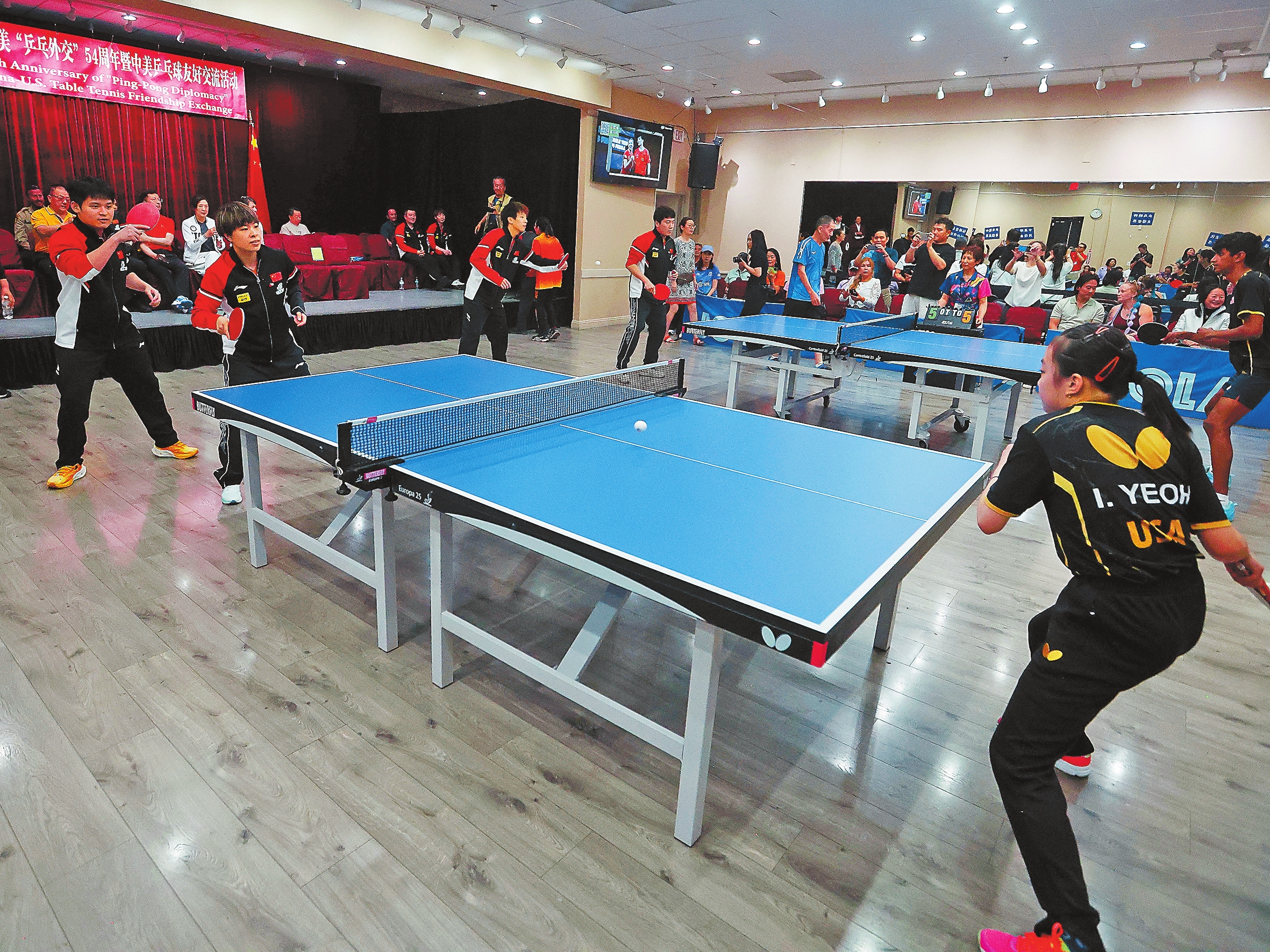 纪念中美“乒乓外交”54周年暨中美乒乓球友好交流活动13日在美国内华达州拉斯维加斯举行。正在此间参加世界乒乓球职业大联盟(WTT)美国大满贯赛的多名中国球员走入当地社区,与美国乒乓球队运动员和当地乒乓球爱好者开展友谊交流,共话“乒乓外交”的历史和现实意义。 图为7月13日在美国内华达州拉斯维加斯拍摄的纪念中美“乒乓外交”54周年暨中美乒乓球友好交流活动现场。 新华社发 邱晨 摄