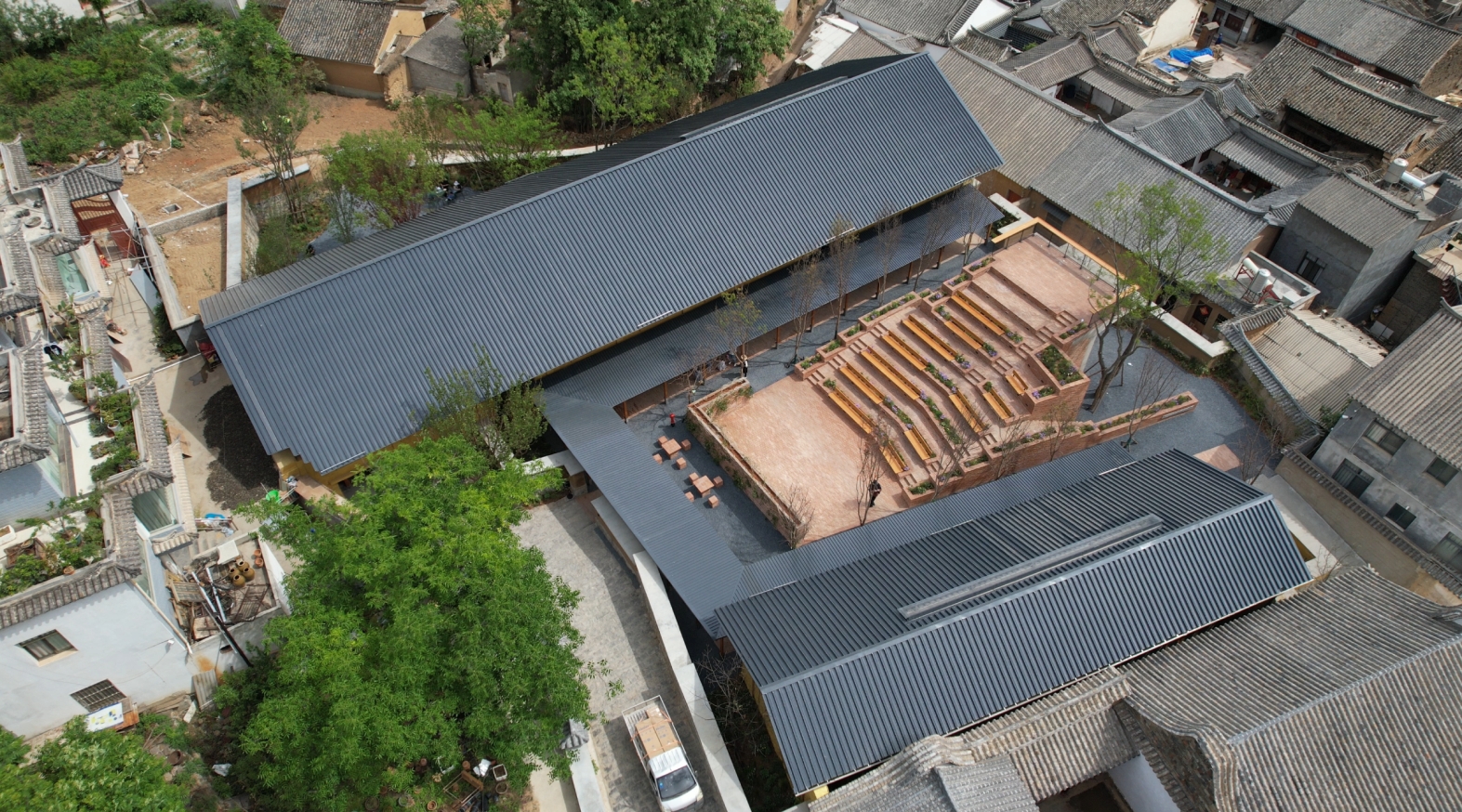 书局内,最有特色的当数8米书墙背后的空间实验。一条红砖密道通向半开放式阅读区,透过3个金色墙洞,坝子尽头绵延的稻田尽收眼底。这种“窥视”设计,暗合《爨宝子碑》野、蛮、怪的美学特质,使读者在翻阅《爨文化史》时,仿佛能穿越时空,望见两千年前的文明现场。24小时开放的诗歌花园同样别具一格。红砖诗歌座椅错落有致,置身其中,仿若陷落于黄金怀抱。拾级而上,白雾坝子的美景一览无余,令人心旷神怡;俯行而下,面对红墙,又会产生一种仪式般的庄重感,延续了粮仓广场的公共基因。