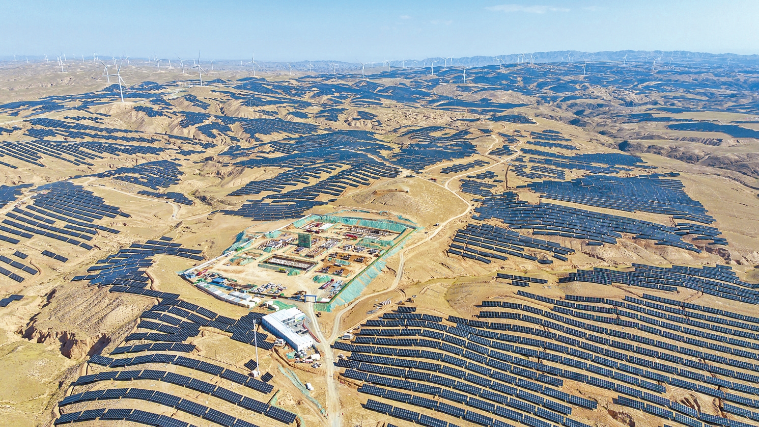 位于宁夏中卫市沙坡头区的宁夏电投永利(中卫)300万千瓦光伏绿电项目占地约11.8万亩,是宁夏重点大型新能源绿电项目,也是国内在建的最大单体光伏项目之一。该项目配套建设3座330千伏变电站,接入甘塘750千伏变电站,将宁夏地区绿电通过“宁电入湘”通道输送到湖南。图为中卫300万千瓦光伏绿电项目2号330千伏变电站建设现场。新华社记者 王鹏 摄