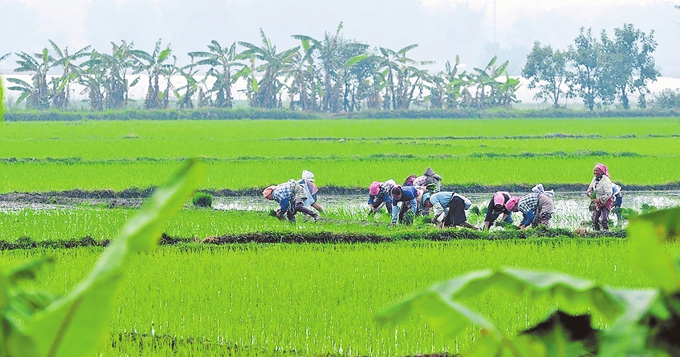 在勐遮镇曼洪村的田间地头,隆隆的农机正高效作业,抽水机抽水灌溉、旋耕机翻耕松土,村民们卷起裤腿、手持翠绿秧苗,或独立劳作,或协作成组,娴熟地将一株株秧苗插入泥田。