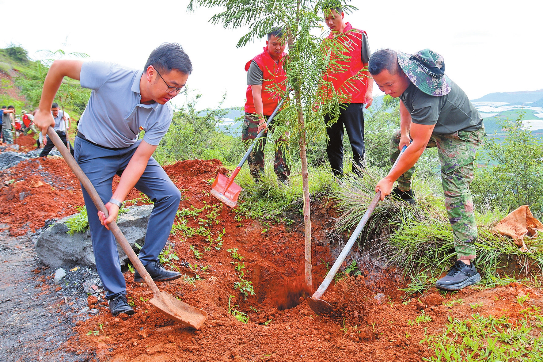 近日,宾川县大营镇组织党员干部、青年志愿者、巾帼志愿者等,到黑家邑村滇中引水便道沿线开展“绿色宾川党旗红”义务植树活动。大家挥锹铲土、相互合作,种下200余株凤凰木苗、香樟树苗,为滇中引水工程沿线增添一抹新绿。