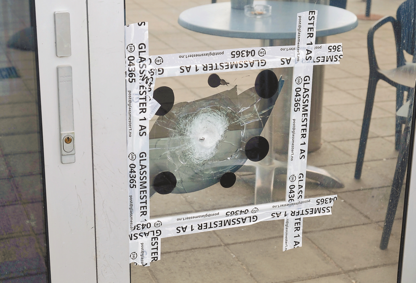 挪威警方7月19日说,首都奥斯陆一家购物中心当天下午发生枪击事件,造成一人受伤。嫌疑人在逃。图为7月20日在奥斯陆特韦塔购物中心拍摄的一处玻璃门上留下的弹孔。