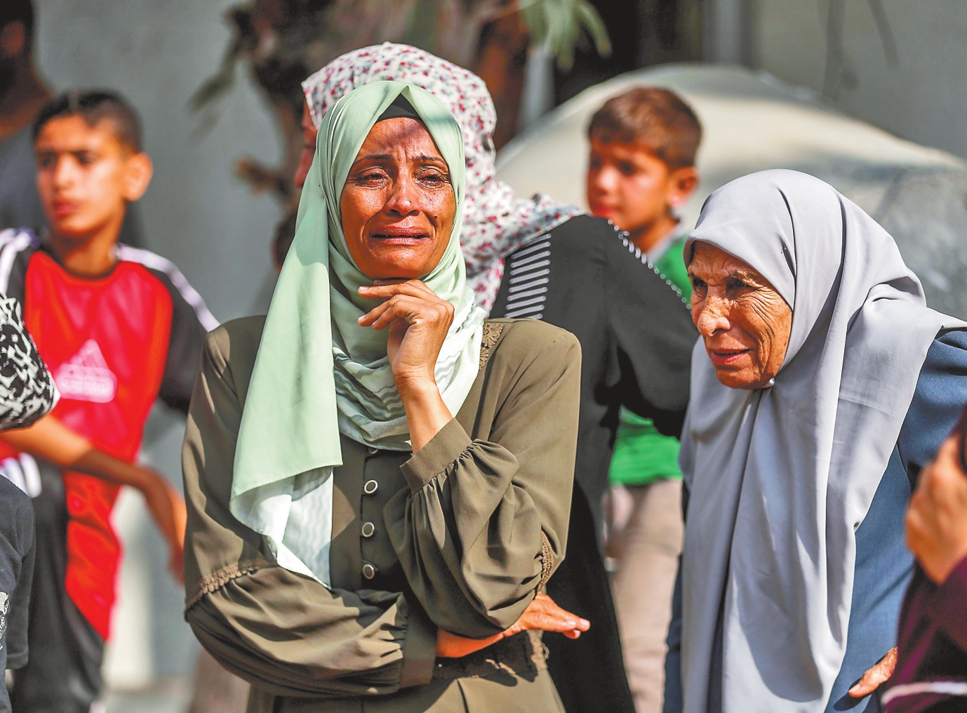 7月21日,巴勒斯坦民众在加沙城的一所医院悼念以军袭击中的遇难者。巴勒斯坦加沙地带卫生部门21日发表声明说,自2023年10月新一轮巴以冲突爆发以来,以色列在加沙地带的军事行动已造成59029人死亡、142135人受伤。