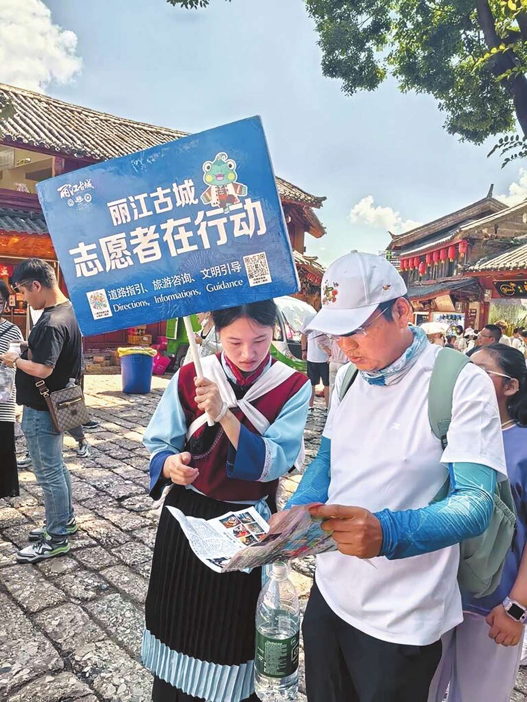“一直往前走就是大水车,那是丽江古城的一个出口,打车、坐公交都很方便……”现在正值暑期旅游高峰,丽江古城景区的志愿者积极行动,热情为游客提供专业的服务。