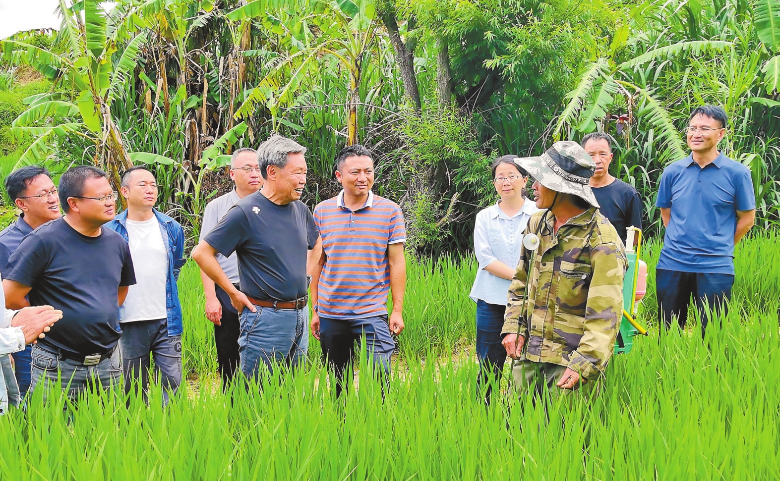 烈日下,朱有勇一行深入核心地块,仔细查看稻情。“施肥了吗?怎么防病?有信心吗?”在田间,朱有勇对正在劳作的村民杨自旺抛出三个问题。得到肯定答复后,他再次向村民们讲解了“预防为主、综合防治”的方针,并开出精准“药方”:“差异化施肥,只对弱苗区域进行补充;强化预防,大面积施药,打好病虫害预防针,局部重点防治结合;大家还要有信心,勇于尝试科学防控方法。”