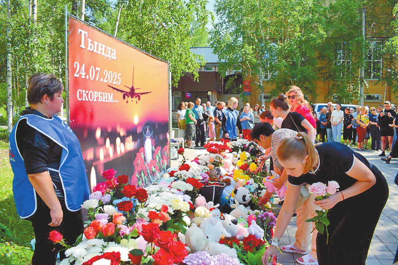 7月25日,人们在俄罗斯阿穆尔州滕达市悼念客机失事遇难者。一架由俄罗斯安加拉航空公司运营的安-24客机24日在阿穆尔州滕达市郊坠毁,机上43名乘客和6名机组人员全部遇难。俄罗斯阿穆尔州和哈巴罗夫斯克边疆区从25日起为安-24客机失事遇难者哀悼三天。新华社发 俄罗斯滕达市政府新闻处供图