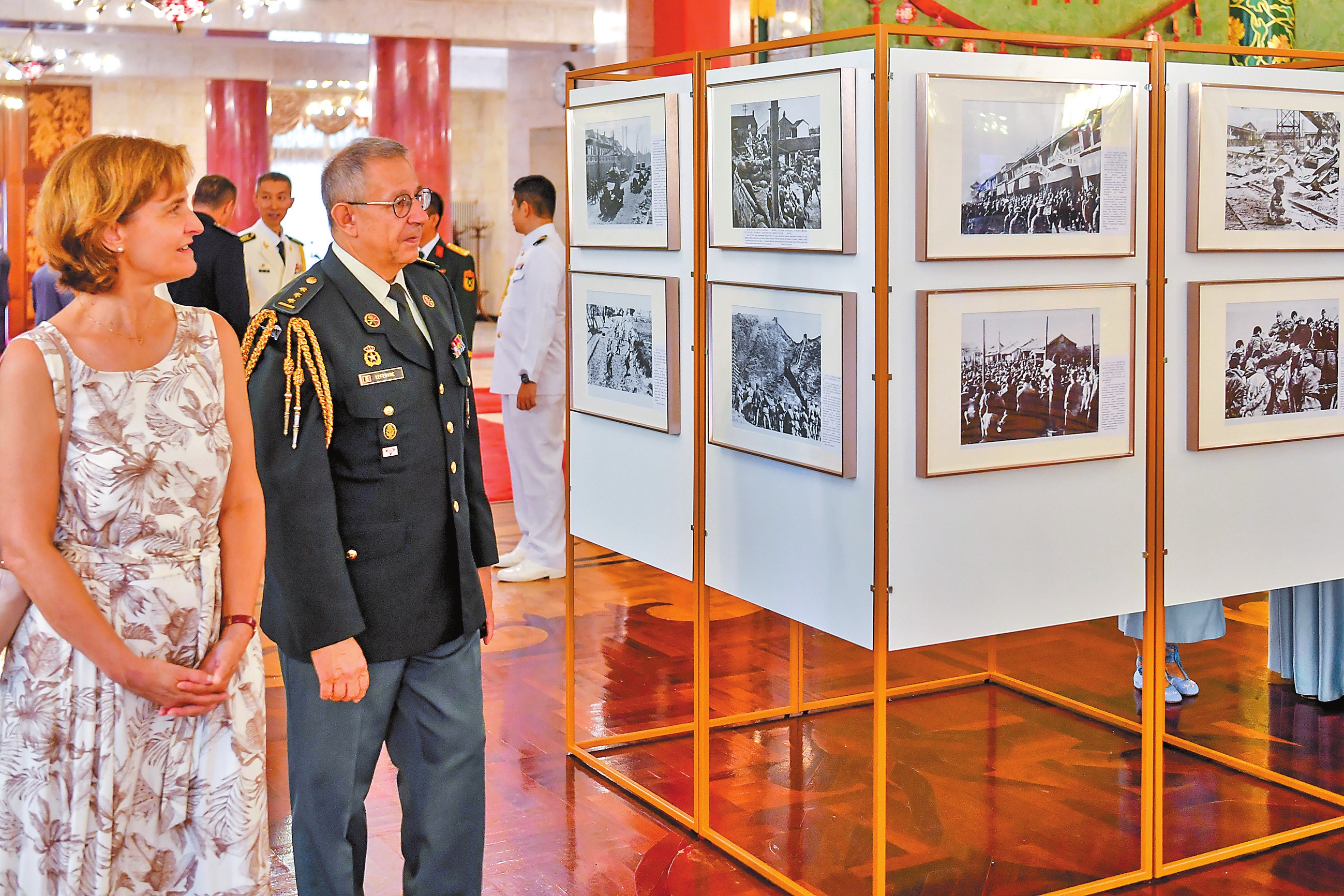 7月24日,在俄罗斯首都莫斯科,嘉宾参观纪念中国人民抗日战争暨世界反法西斯战争胜利80周年图片展。“铭记历史 开创未来”——纪念中国人民抗日战争暨世界反法西斯战争胜利80周年图片展当天在中国驻俄罗斯大使馆举办。本次图片展精选的照片生动回顾了中国人民英勇抗击日本侵略者历史,介绍苏联航空志愿队与中国人民共同抗战的感人事迹,彰显中俄两国人民在世界反法西斯战争期间结下的深厚战斗情谊。