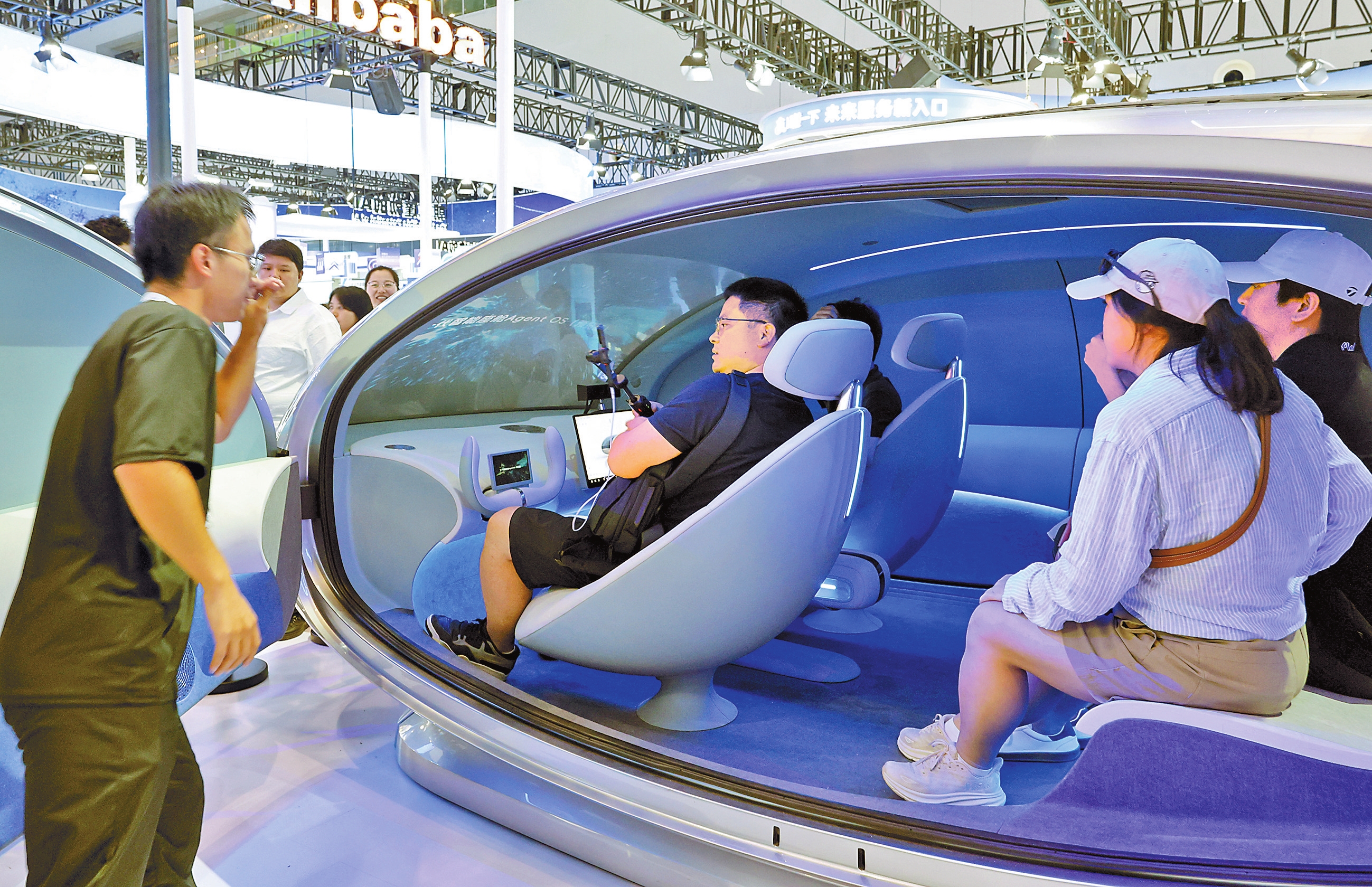 7月27日,参观者在体验乘坐一款基于阶跃星辰大模型打造的未来座舱。正在上海举行的2025世界人工智能大会展览现场,参观者与能分拣物品打扫房间的机器人、具备拍摄导航语音翻译功能的智能眼镜、AI艺术创作系统、基于AI大模型打造的驾驶座舱等众多AI科技前沿产品零距离互动,仿佛置身未来世界,感受科技之美。 新华社记者 方喆 摄