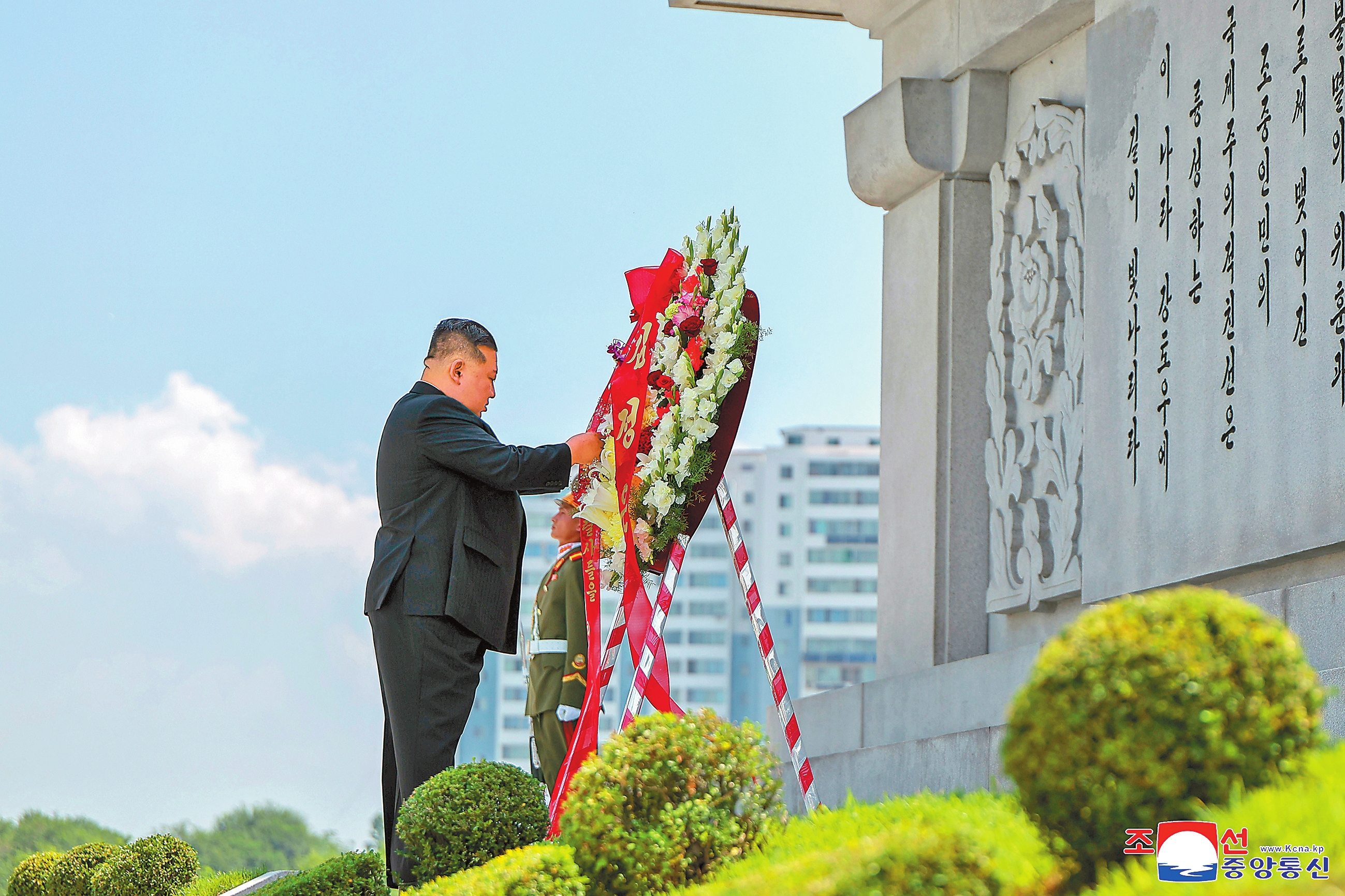图为7月26日,朝鲜劳动党总书记、国务委员长金正恩在首都平壤参谒中朝友谊塔。新华社/朝中社