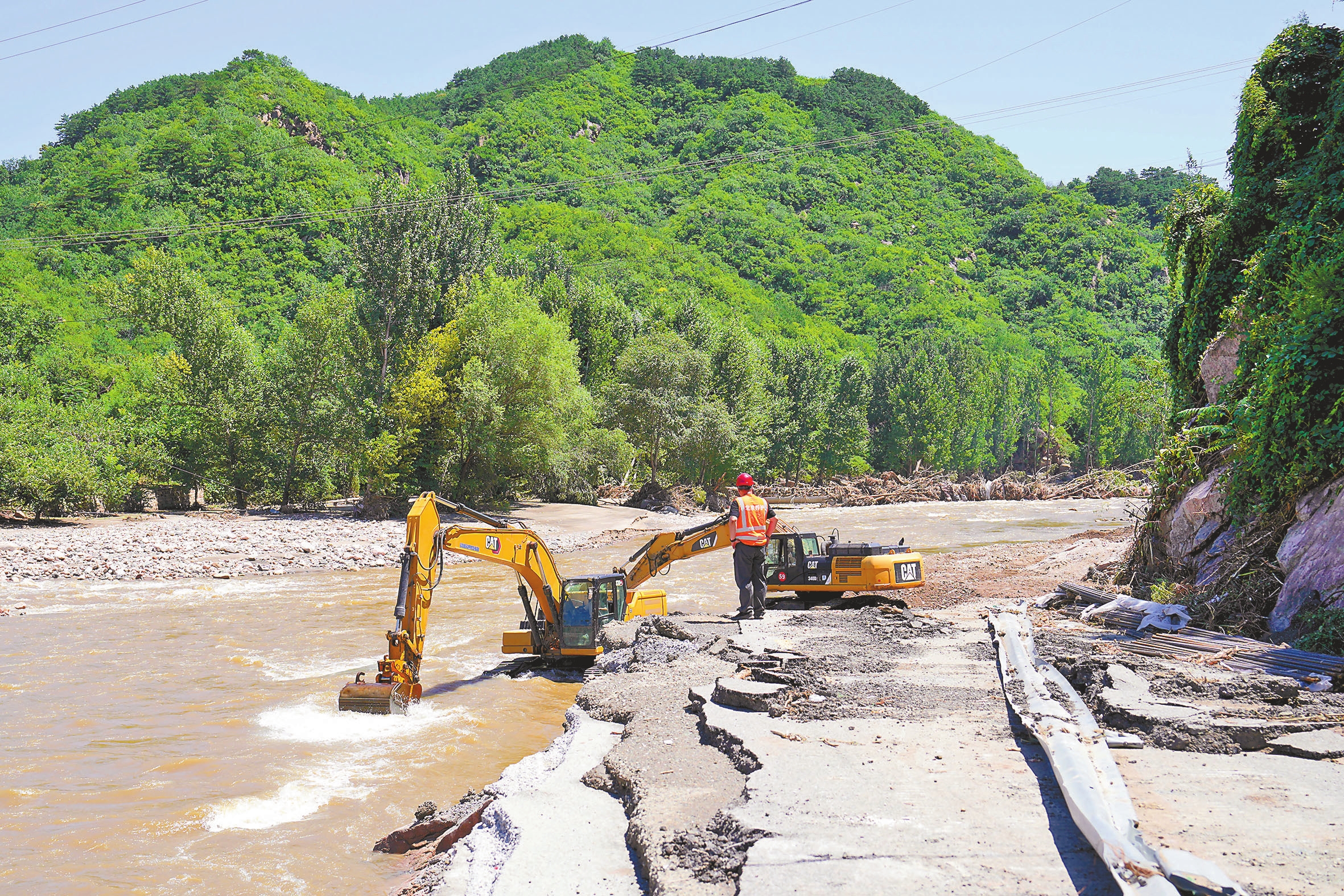 近日,受连续强降雨影响,北京多个区数百个村受灾,山区道路和多种基础设施受损。目前,救援人员正加紧修复受损的桥梁、道路,打通山区“生命通道”,保障生活物资和救援设施运输顺畅。右图为7月30日,在北京市密云区冯家峪镇,道路抢修人员整修道路。新华社记者 鞠焕宗 摄