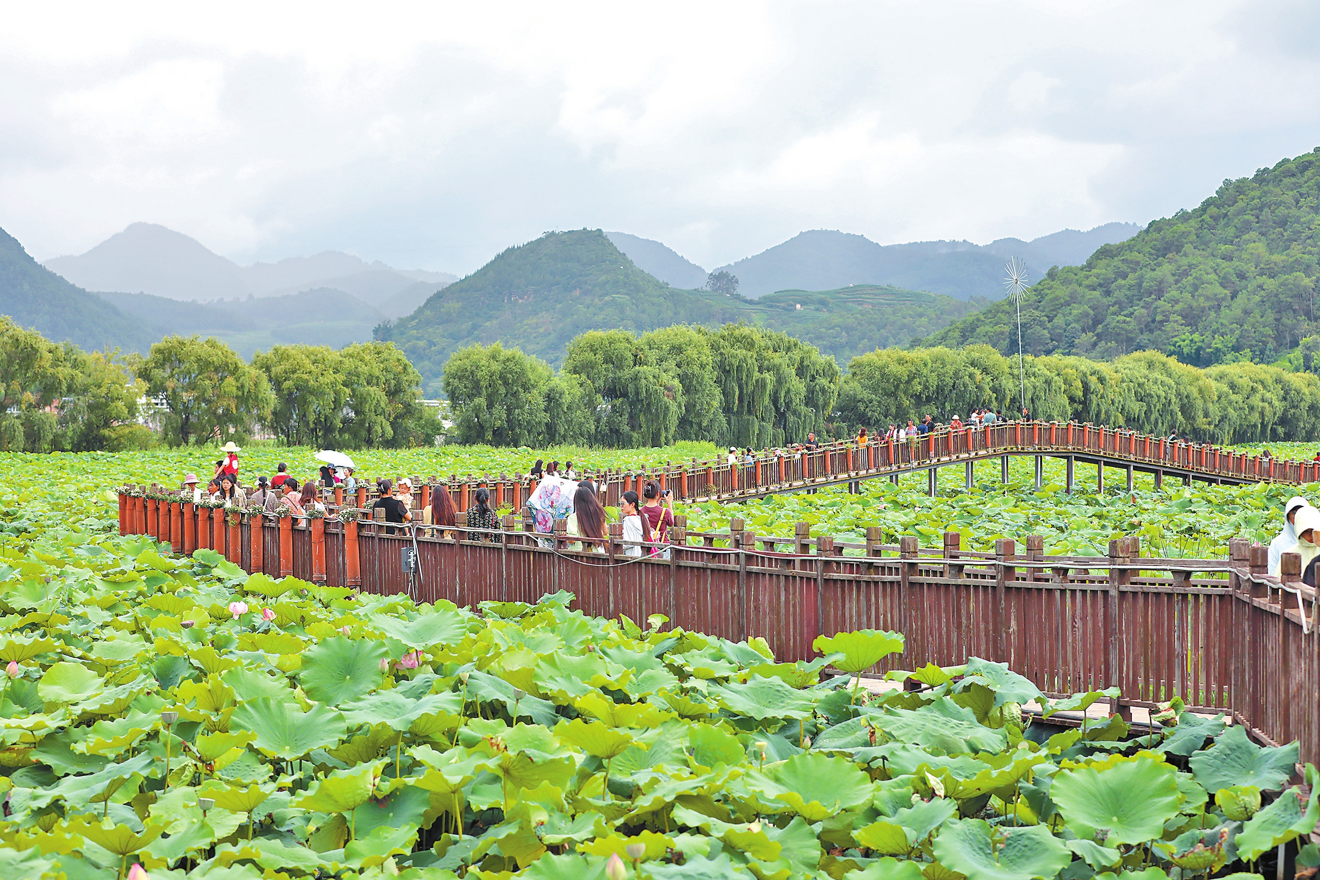 近日,施甸县姚关镇野鸭湖湿地千亩荷花竞相绽放,一年一度的姚关荷花节也拉开帷幕。荷花节上,举行了赏荷、文艺展演、美食体验等多元活动,吸引了来自全国各地的游客共赴这场夏日之约。近年来,施甸县依托野鸭湖国家AAA级景区,在当地形成了“荷花观赏+特色餐饮+民宿体验+农产品销售”乡村旅游产业链。