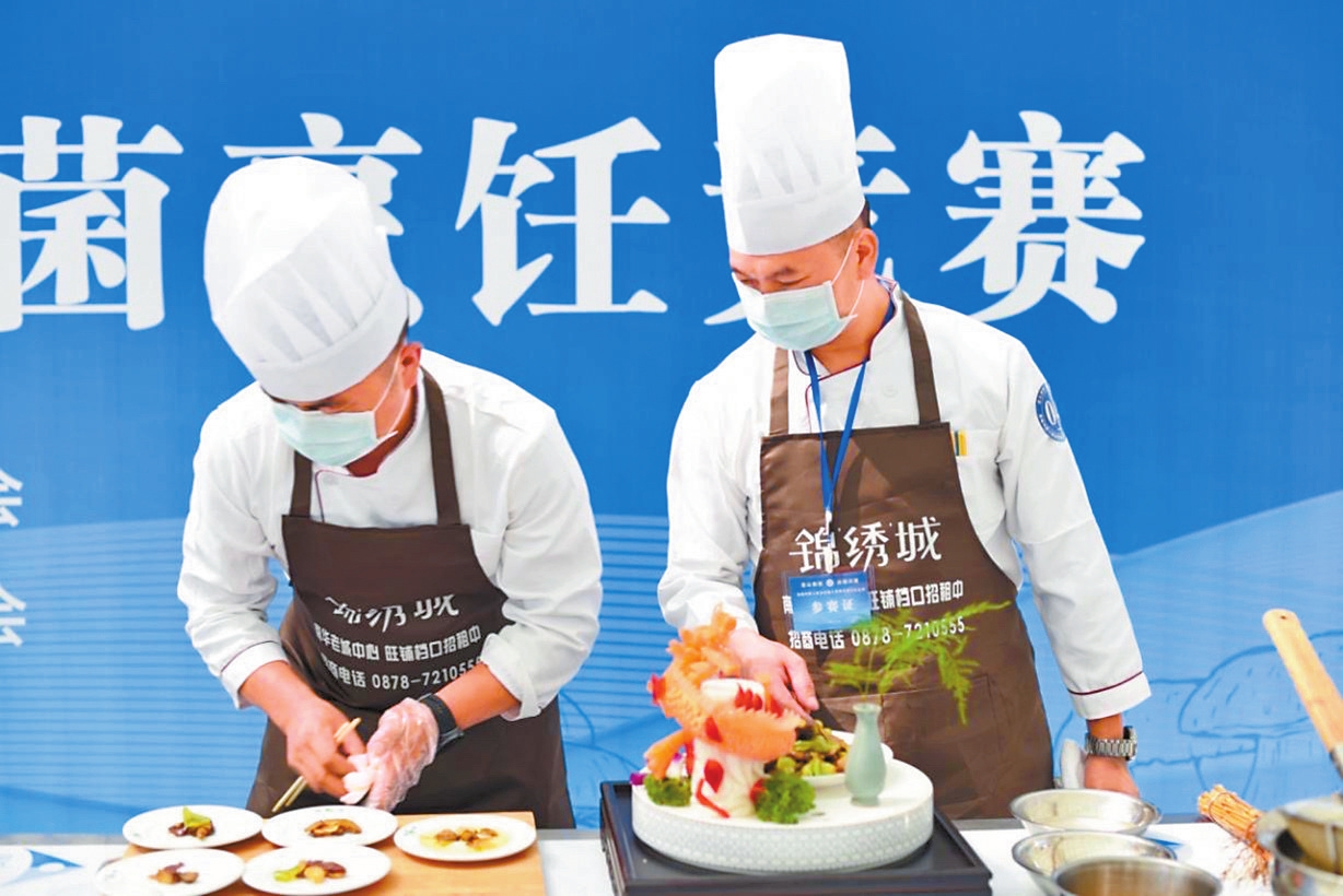 图为厨师烹制野生菌佳肴。