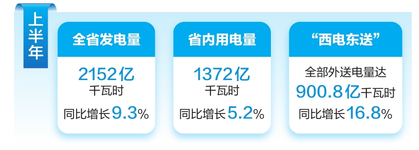 发电量、用电量、送电量持续增长,有力支撑全省经济发展。上半年,全省发电量、省内用电量分别为2152亿千瓦时、1372亿千瓦时,同比分别增长9.3%、5.2%;“西电东送”较计划增长,全部外送电量达900.8亿千瓦时,同比增长16.8%。截至6月底,全省电力装机突破1.66亿千瓦,其中,绿色电力装机超过1.5亿千瓦,居全国首位,绿色装机占比突破90%,绿色底色更加鲜明。