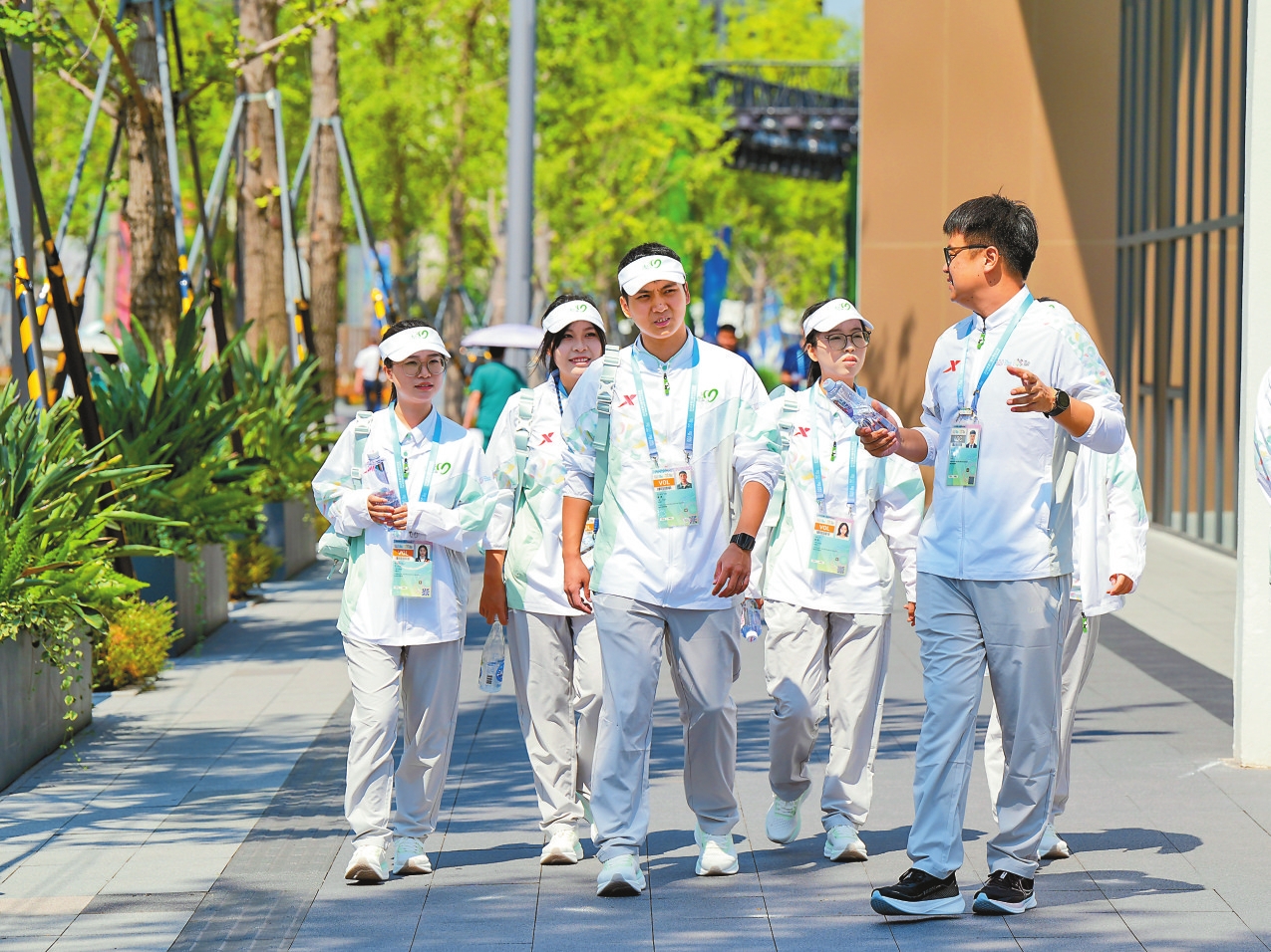 8月3日,2025年第12届世界运动会运动员村正式开村。据悉,成都世运会运动员村分为A、B两区,均为既有酒店设施布置,运行时间为2025年8月3日至8月18日,预计将为约7000名参赛者提供注册、医疗、餐饮、文化体验、商业休闲、物流等服务。图为当日,志愿者在成都世运会运动员村A区巡村。