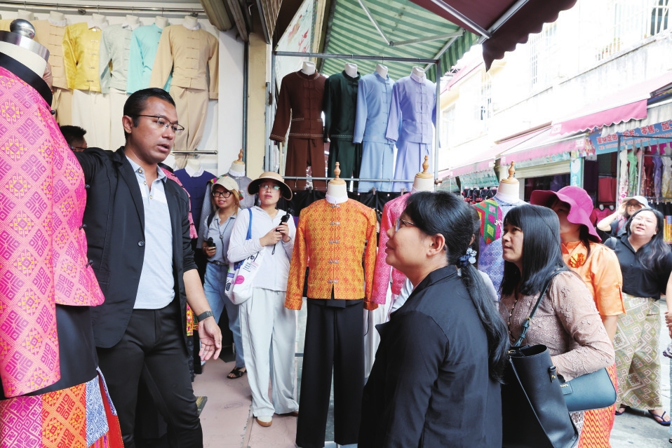 芒市丙午街的傣族服饰店里,店主岳岩林和妻子王大晶的婚纱照与在婚礼上穿过的傣式礼服共同陈列。“我们融合中缅顾客的穿着喜好,加强散热设计,裤装也改良得更方便穿脱。”喜欢钻研的岳岩林还在不断学习新的智能设计技术。泼水节前夕和婚礼季是销售旺季,岳岩林和隔壁的缅甸店主王秋不约而同地选择通过电商平台推广生意。“现在很多当地人喜欢把改良傣装用作婚礼服,我在平台上发布自己的设计,客户喜欢的话就会来线下看看,”王秋笑着说。