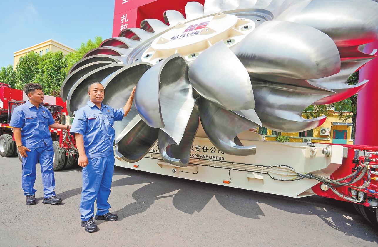 7月2日,在哈尔滨电机厂有限责任公司厂区,焊接人员在介绍世界首台单机500兆瓦冲击式水轮发电机组转轮的焊接位置。用“数智化”等先进技术改造提升传统产业已成为中国老工业基地哈尔滨发展新质生产力的重要路径。近年来,哈尔滨把科技创新作为产业跃迁动力,让传统装备制造业领域绽放新光。 新华社记者 王建威 摄