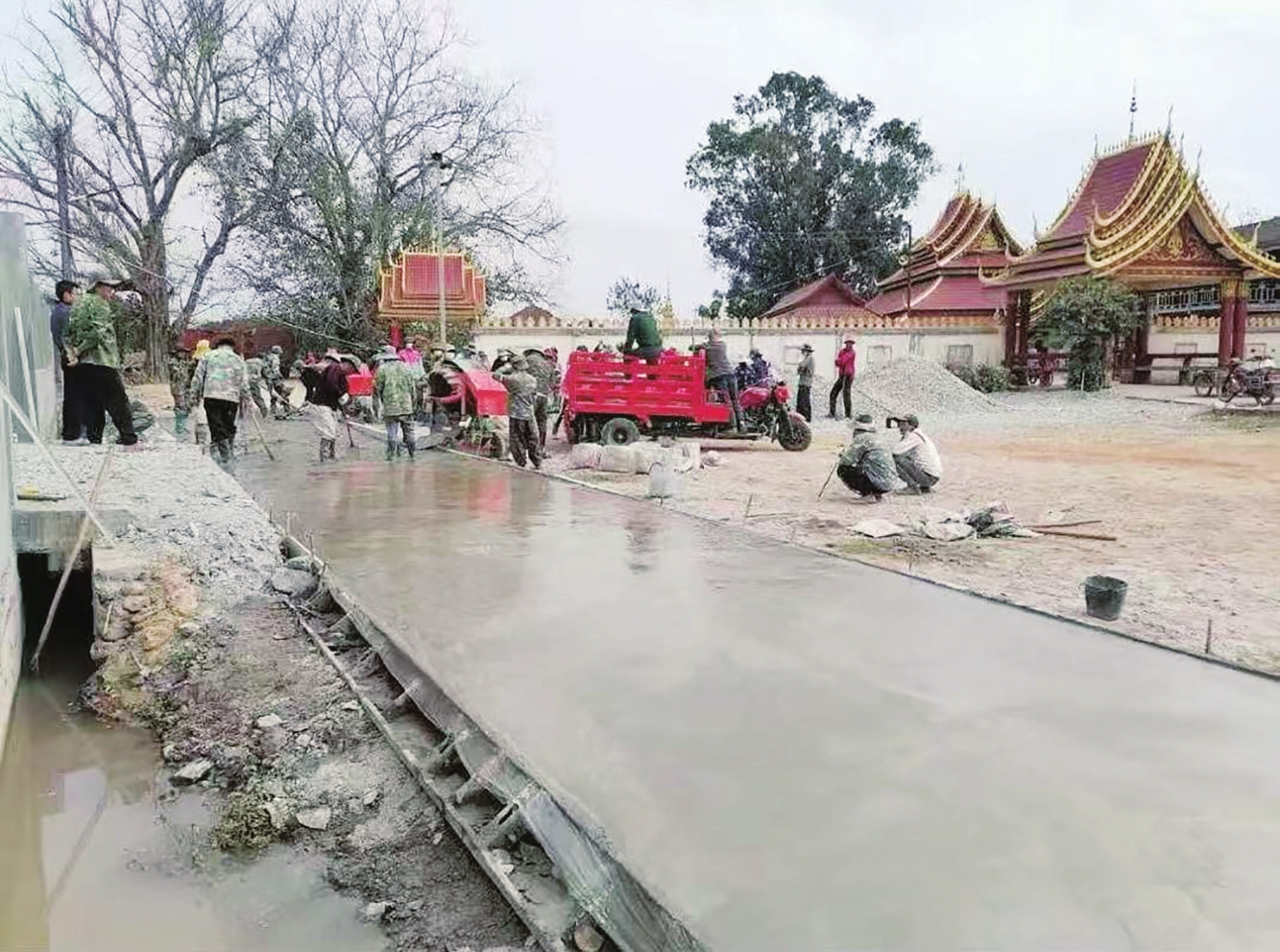 得知曼纳坎村的需求后,岩书立即和村干部们一起商议如何帮助友好村寨。在大家的共同努力下,通过多方筹措,前后共筹集到了66吨水泥,并在2024年11月全部捐赠给了曼纳坎村。如今,曼纳坎村的村民们热火朝天地铺设着村道,一段段平整的路基在村寨各处延伸开来。