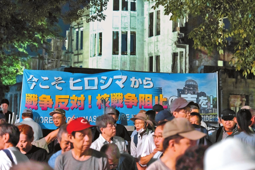 8月5日,民众在日本广岛和平纪念公园举行反战集会。日本广岛市6日在和平纪念公园举行遭原子弹轰炸80周年纪念仪式。来自日本各地的民众在广岛原子弹轰炸遗址前集会,批评日本政府实施军备扩张政策,呼吁以实际行动守护和平宪法,防止重蹈战争覆辙。新华社记者 贾浩成 摄