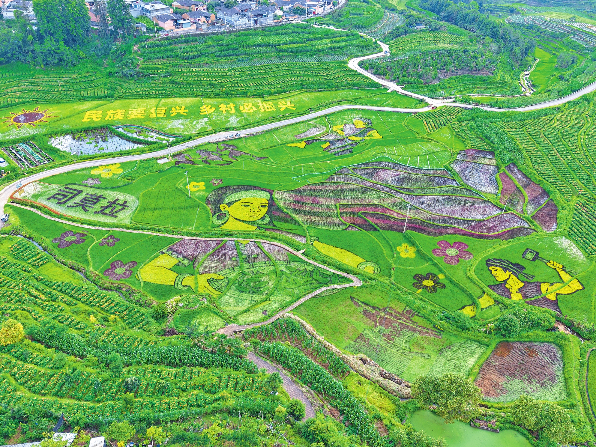 彩色稻田是司莫拉佤族村连续5年种植的特色农业景观。今年的彩色稻田以“民族要复兴 乡村必振兴”为主题,将紫叶稻、黄叶稻与绿叶稻等巧妙搭配。从司莫拉佤族村的高处俯瞰,彩色稻田如一块天然调色板,“镶嵌”在青山环抱的田野中,与远山、村庄交相辉映。