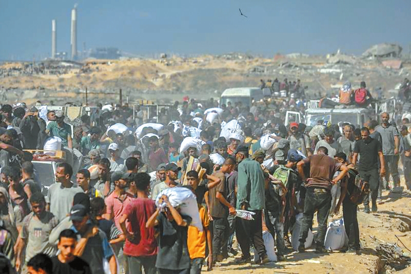 联合国机构8月6日发布的最新报告指出,加沙地带目前可耕种的农田面积占比仅1.5%,当地正濒临“全面饥荒”。图为8月5日,在加沙地带拜特拉希耶,人们搬运援助物资。新华社发 里泽克·阿卜杜勒贾瓦德 摄