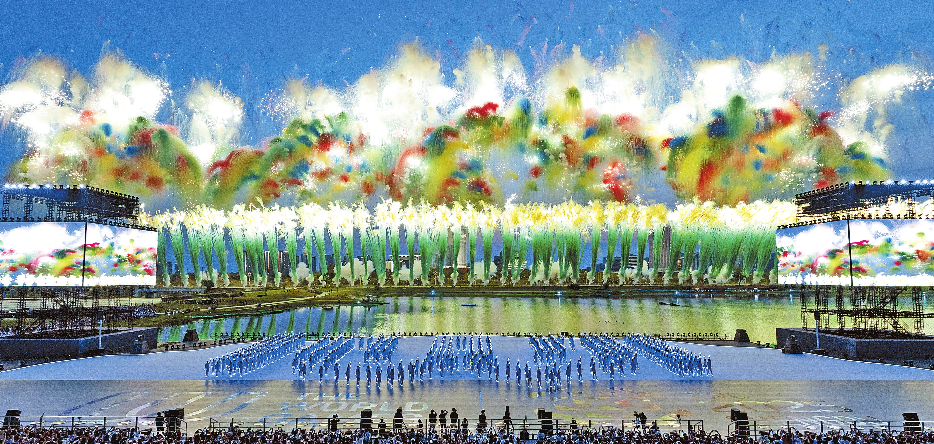 随后,在“天府之檐”下,文体表演《锦绣之韵》、主题曲表演《友爱之声》接续上演,将运动项目与中华文化、巴蜀元素有机结合,展示出“运动无限 气象万千”的主题。在万众期待下,世运圣火在湖中点燃,以水火相生的科技创新美学,向全世界传递梦想之光。