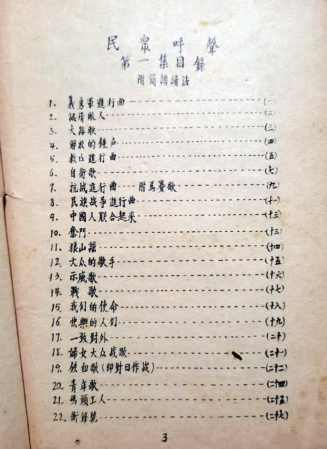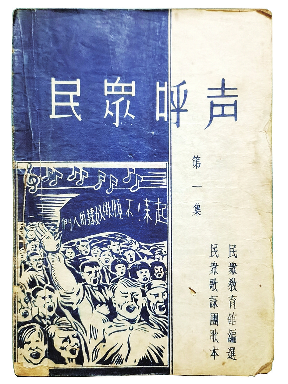 这是1937年9月由民众教育馆编选发行的民众歌咏团歌本《民众呼声》中的一段话。在这个歌本封面除书名、出版单位外,还有醒目的《义勇军进行曲》这首歌中一句铿锵有力的歌词。歌本编选的第一首歌就是《义勇军进行曲》,还有《认清敌人》《解放的钟声》《救亡进行曲》《抗战进行曲》《中国人民联合起来》等20余首歌,每一首歌曲都配有简谱。