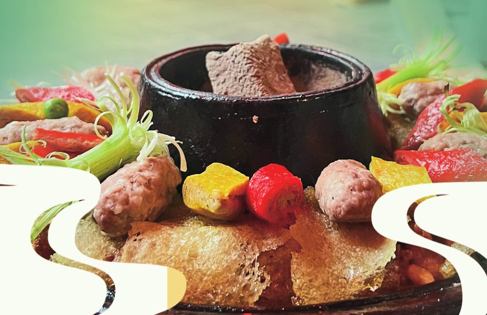 腾冲土锅子讲究“一汤六菜”:猪骨浓汤作底,青菜、芋头铺陈如茵,再叠上酥肉、黄笋、泡皮,最后以金黄的蛋卷覆顶,撒一把青豆点缀,最终熬煮成人间至味。