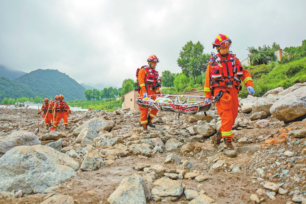 8月9日,甘肃省森林消防总队、国家西北区域应急救援中心在甘肃省兰州市榆中县马坡乡河湾村、城关镇兴隆山村一带全力搜救失联人员。图为国家西北区域应急救援中心指战员在马坡乡旧庄沟村携带救援担架沿河道搜救失联人员。新华社发 张小军 摄