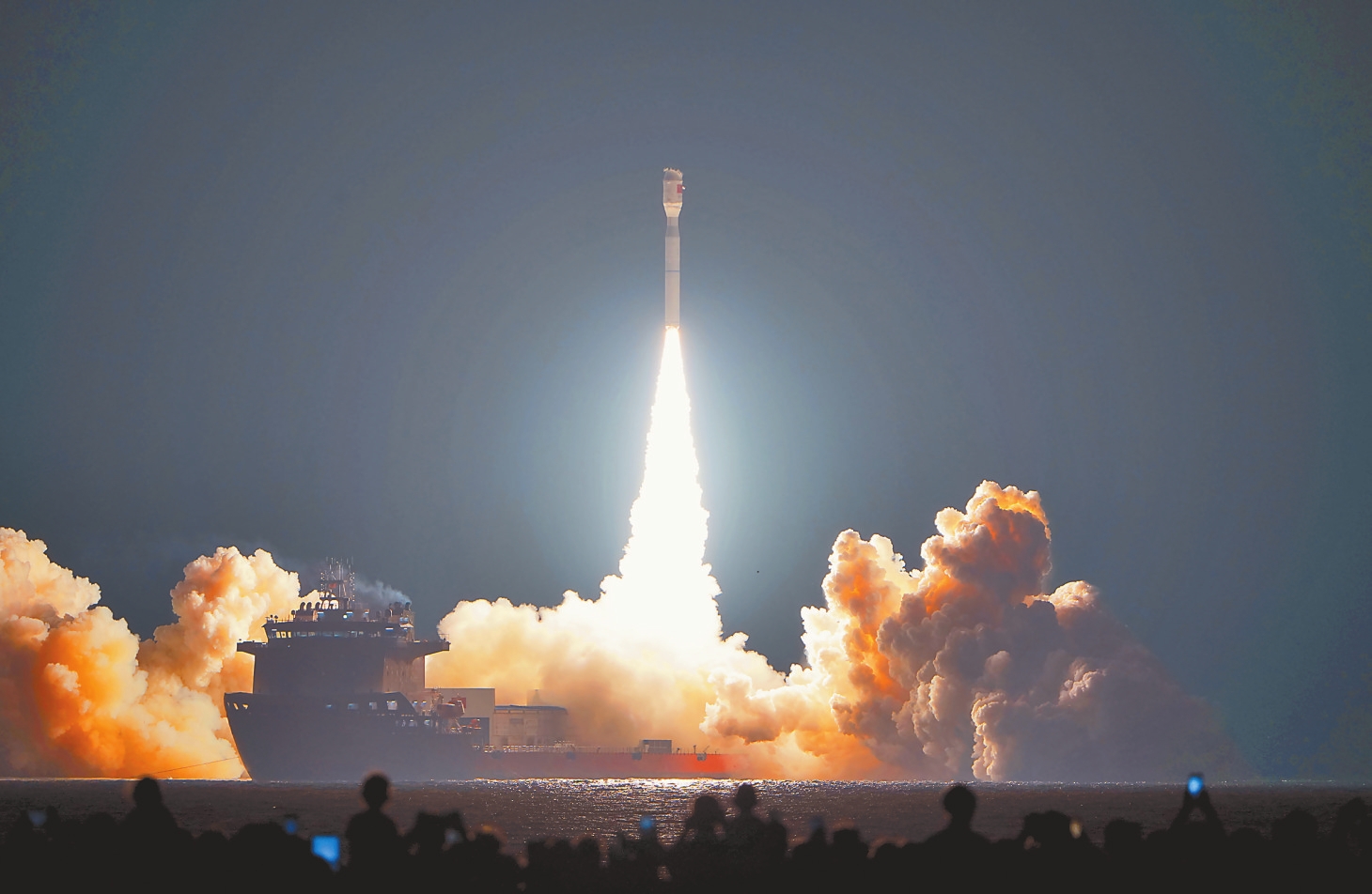 8月9日0时31分,我国太原卫星发射中心在山东日照附近海域使用捷龙三号运载火箭,成功将吉利星座04组卫星发射升空,卫星顺利进入预定轨道,发射任务获得圆满成功。 新华社发 郭金祺 摄