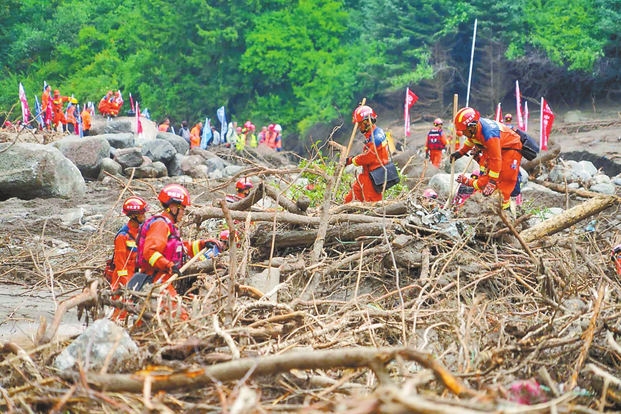 8月10日,在甘肃省榆中县马坡乡,甘肃省森林消防总队、国家西北区域应急救援中心救援人员拉网式搜救失联人员。据悉,甘肃榆中山洪灾害灾毁公路目前已全线抢通,受灾群众供电全部恢复。 新华社发 白期元 摄