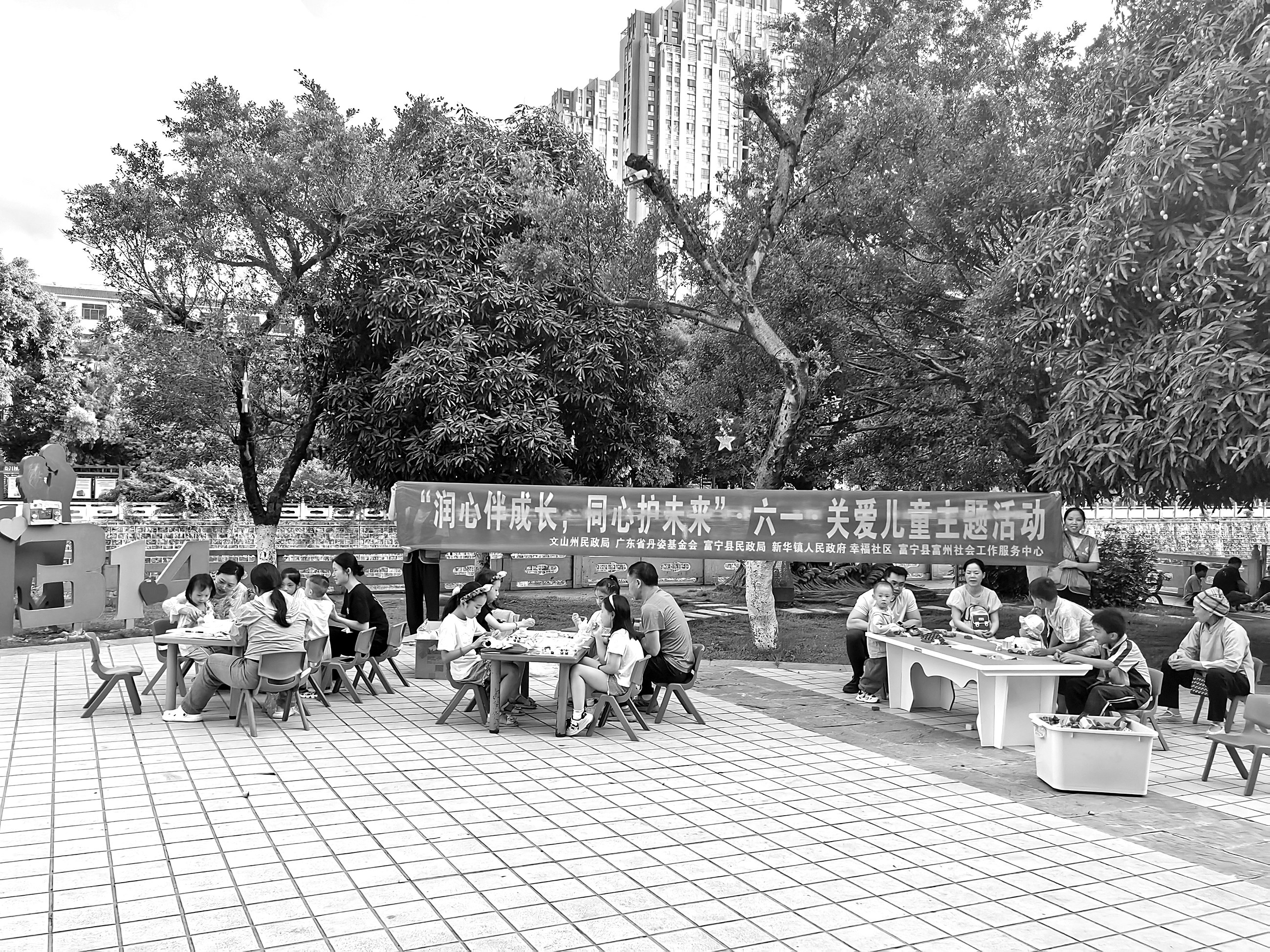 在富宁县幸福社区的中心公园,社工们正在开展一场别开生面的公园趣味运动会。轻便桌椅一摆,彩带围出一个安全区域,跳绳、羽毛球、拔河绳等器材依次排开。不到半小时,50余名儿童就从四面八方汇聚而来。