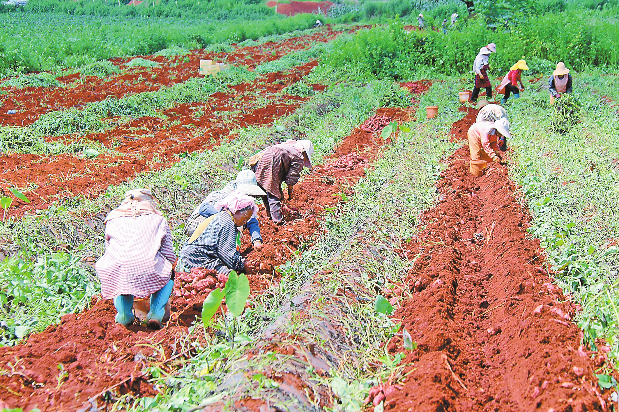 秋收时节,位于砚山县稼依镇的文山博态农业发展有限公司种植基地内,一垄垄红薯和芋头长势喜人,上百名工人挥锄、采挖、归拢、装筐,将成熟的红薯与芋头采收装车,奏响了秋日增收的“丰收曲”。