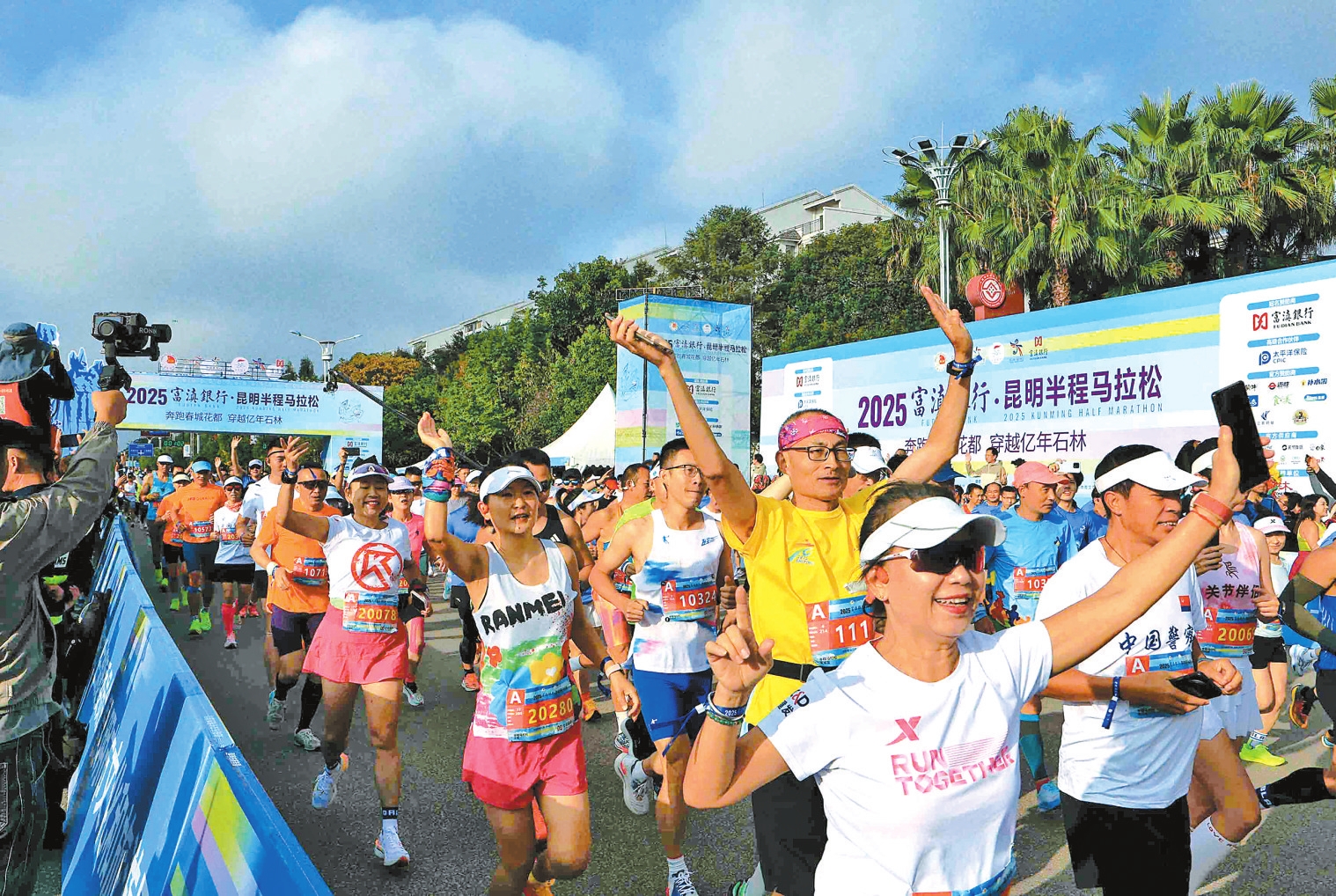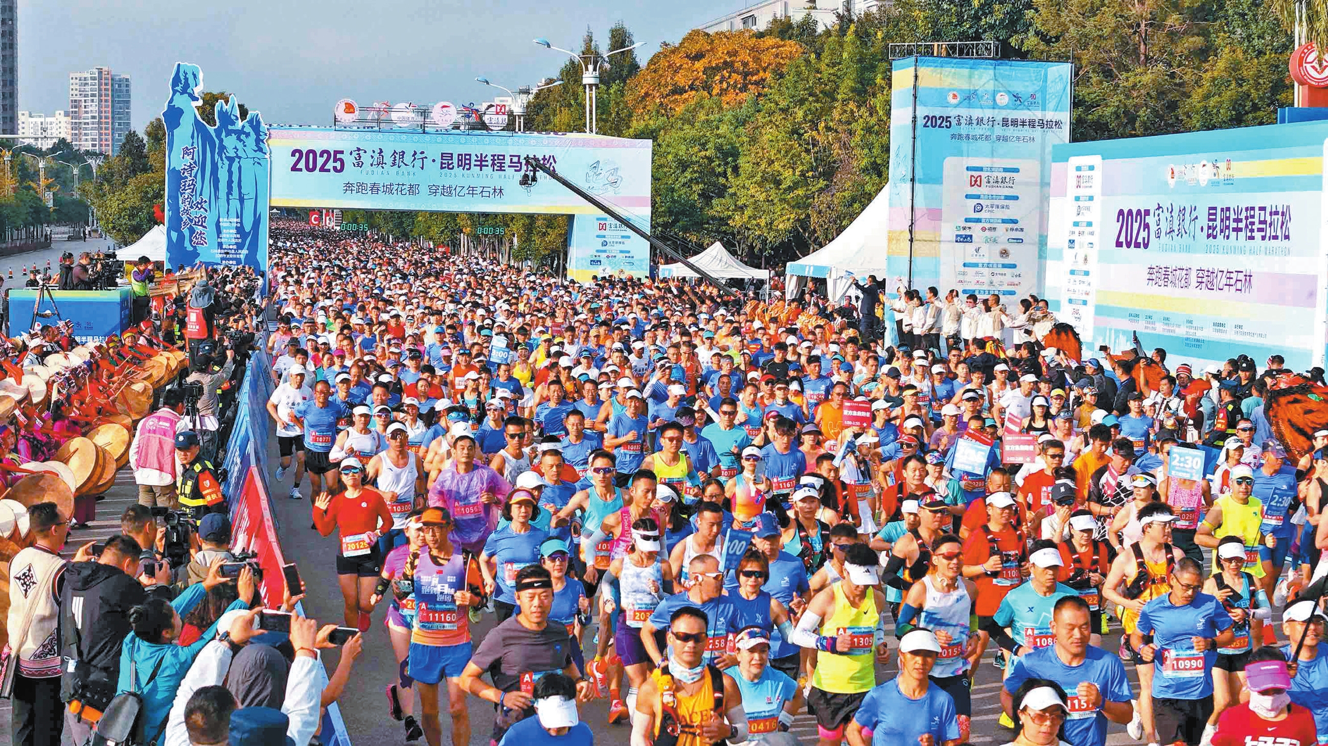 本报讯(记者 熊明) 10月12日8时30分,2025富滇银行·昆明半程马拉松在石林彝族自治县鸣枪开跑。来自全国各地的万名跑者穿越奇石峰丛,感受着被誉为“世界喀斯特精华”的石林赛道。